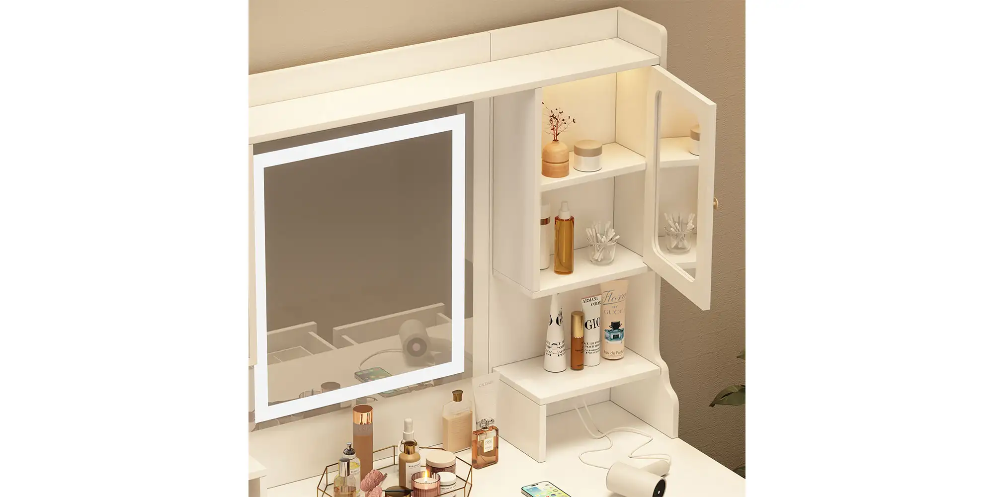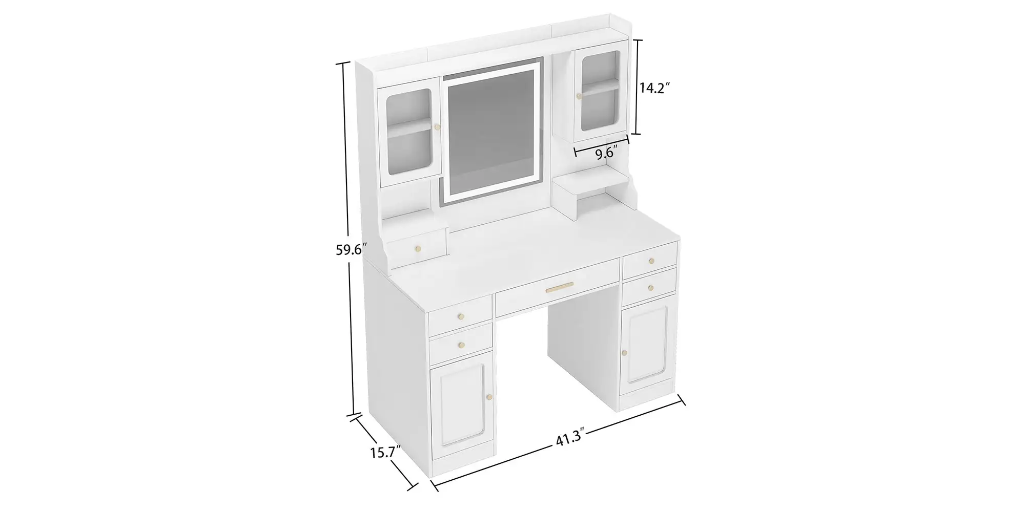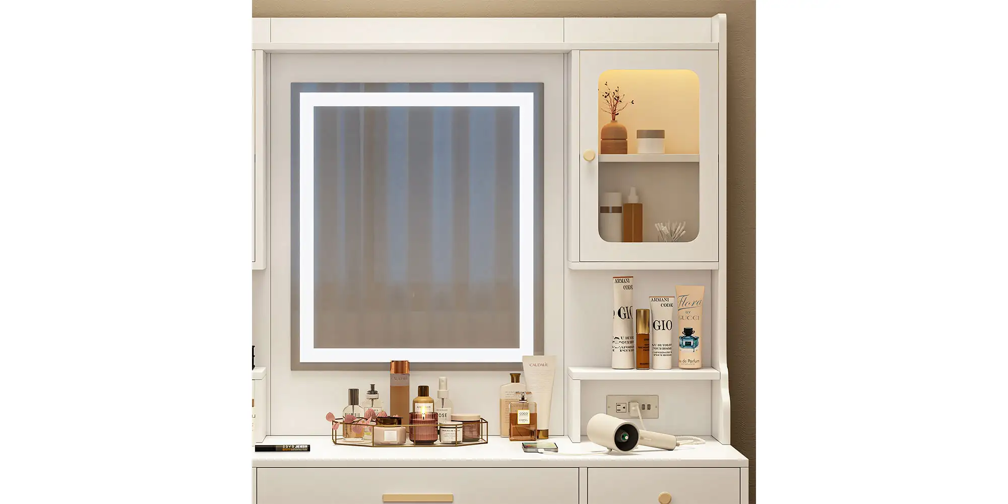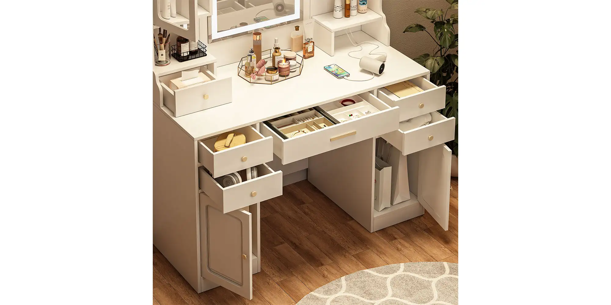 • 1. Espacio de gran capacidad: el tocador con 6 cajones y 4 taquillas, espejo grande y 3 luces cálidas, organiza fácilmente tu maquillaje, joyas y otros accesorios. La mesa del tocador también tiene mucho espacio para tu computadora u otros suministros de oficina. Ahorra dinero y espacio, haz que tu rutina diaria sea más perfecta.