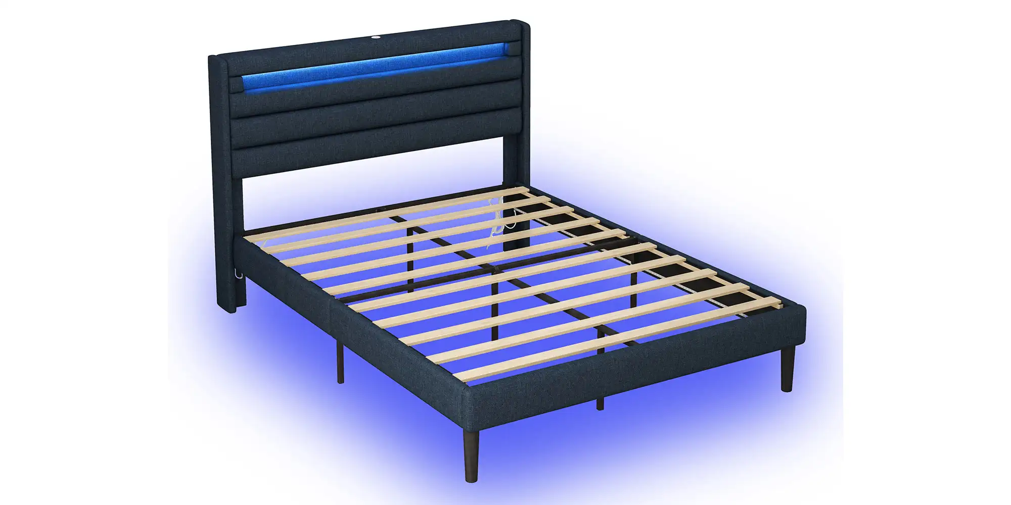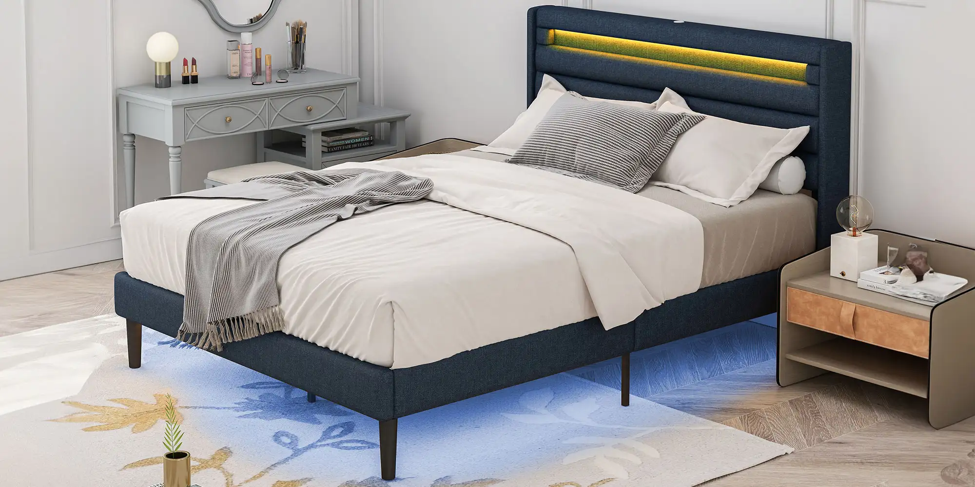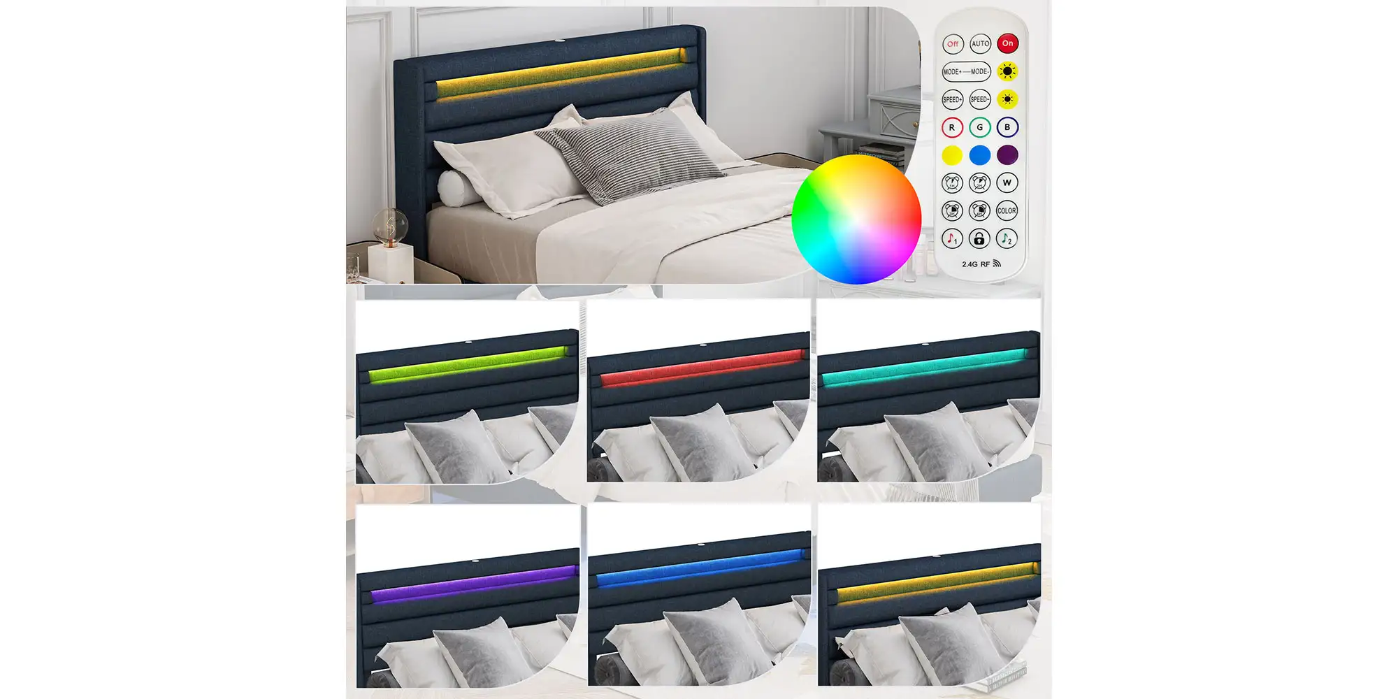 • 2. Atmosphere bed with intelligent LED lights: This bed frame supports headboard LED lights and bed bottom atmosphere lights. The bedside lamp comes in seven colors, and you can use the remote control to choose any color you like to match any indoor theme and aesthetics. The bedside lamp brings a stunning visual effect to the bed frame.