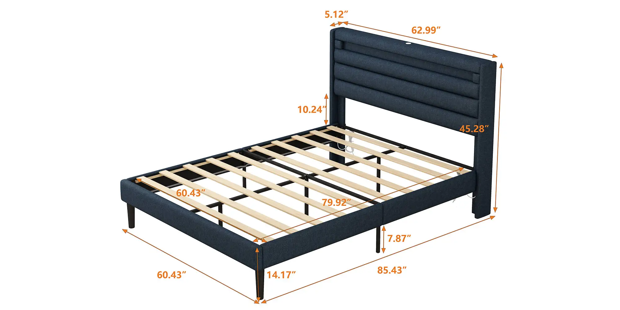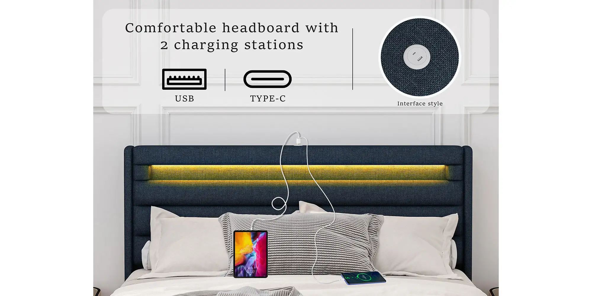 • 1. Headboard with charging station: The headboard of the bed frame is made of MDF material, and the backrest embraces the soothing touch of high-quality linen fabric, decorated with a high elasticity memory sponge layer. Ensure maximum comfort while reading, watching TV, or relaxing. For convenience, a built-in charging station has been added with a USB port, allowing you to charge your phone or tablet without leaving your comfortable bed.