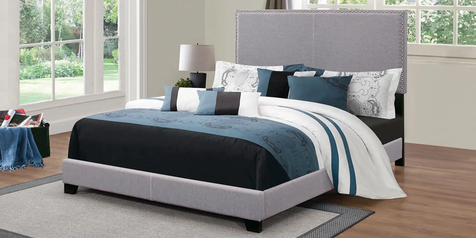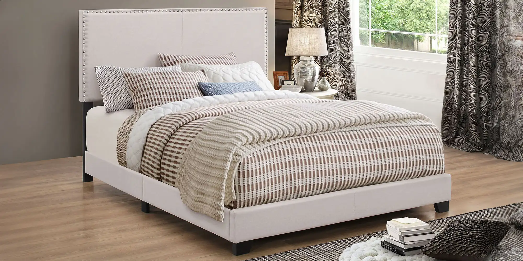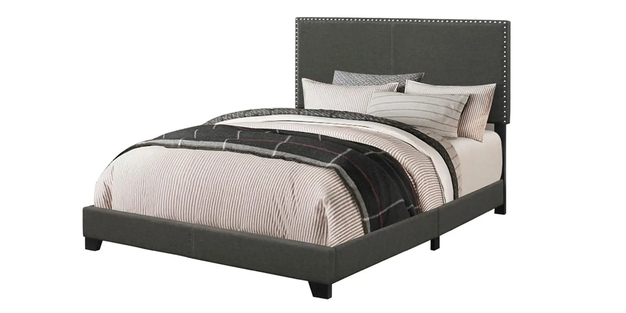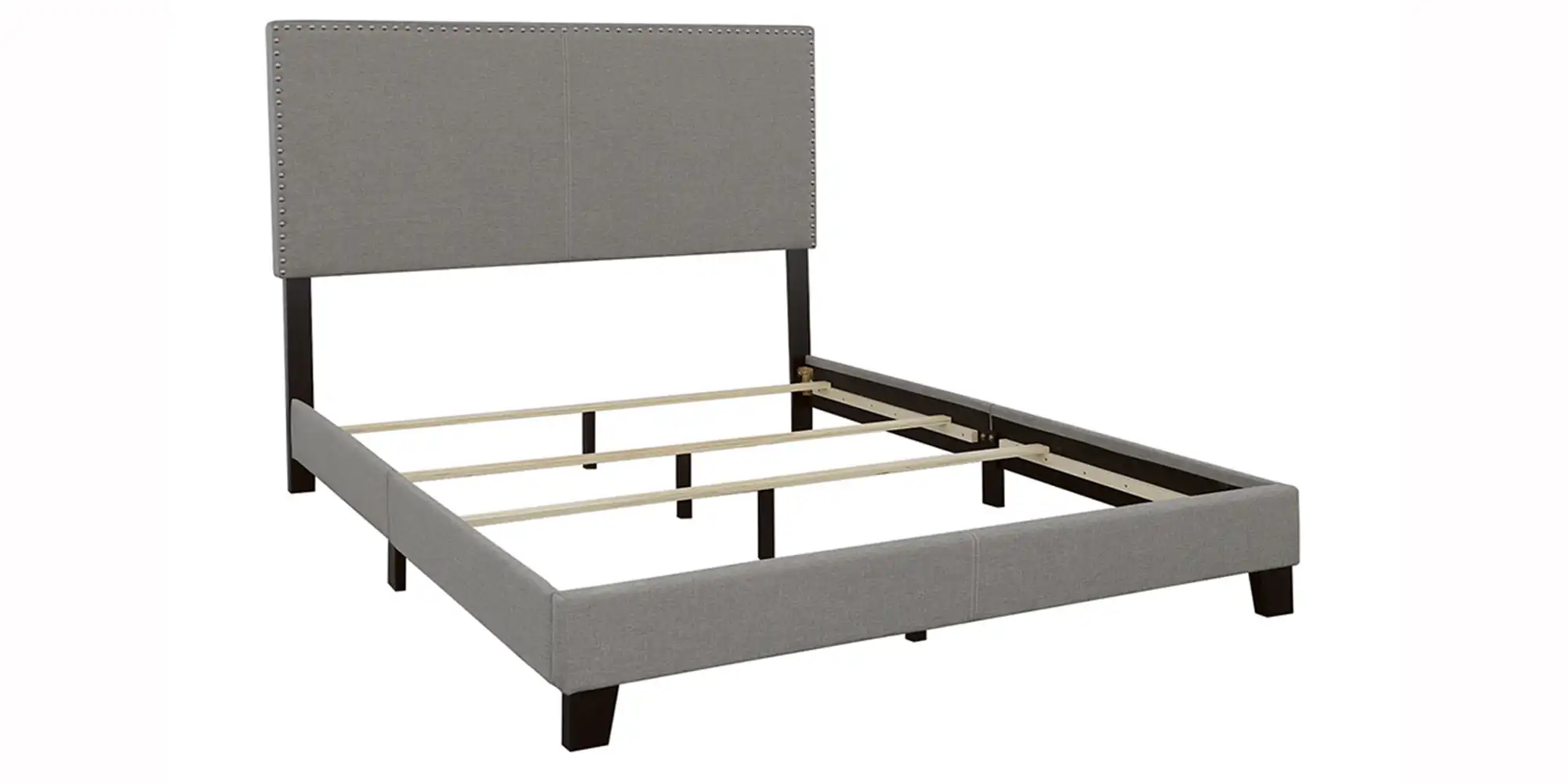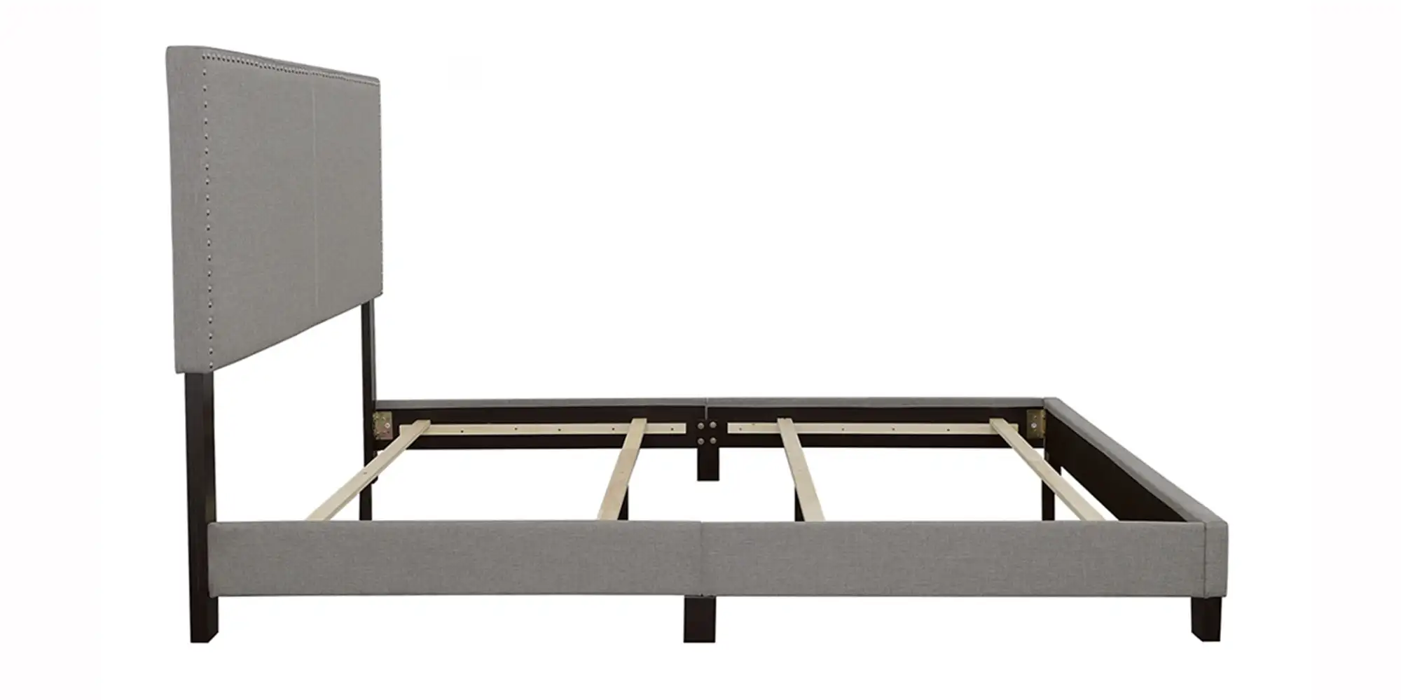 Embrace a relaxed modern style with the smooth edges from this upholstered bed frame. Complete with solid wood legs in black finish, the open frame warms up spaces with simplicity. Chic and individually placed, the chrome nailhead trim adds pops of metallic radiance along the fabric-covered headboard. Constructed of smooth rectangles, the open silhouette feels calm and welcoming. Neutral and soft hues ensure that traditional and contemporary design schemes are maintained.