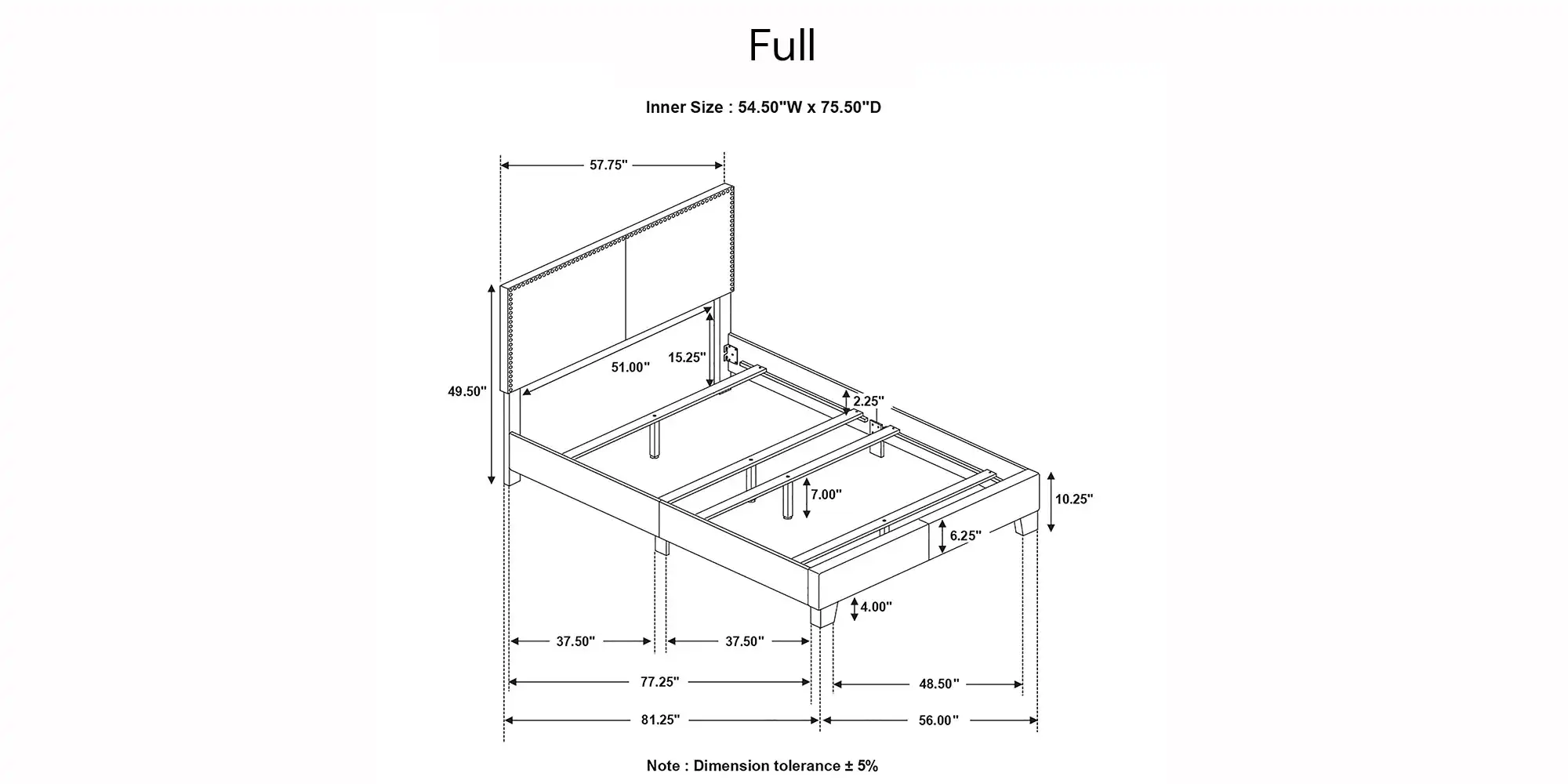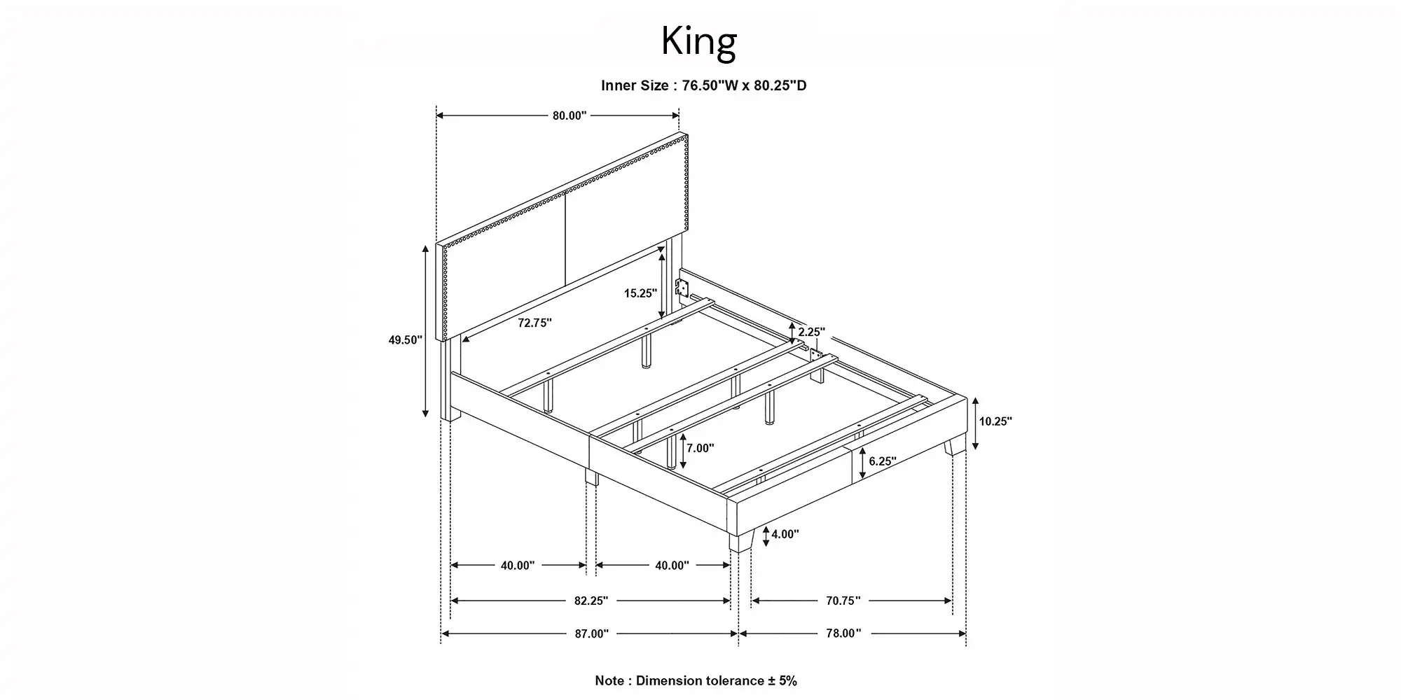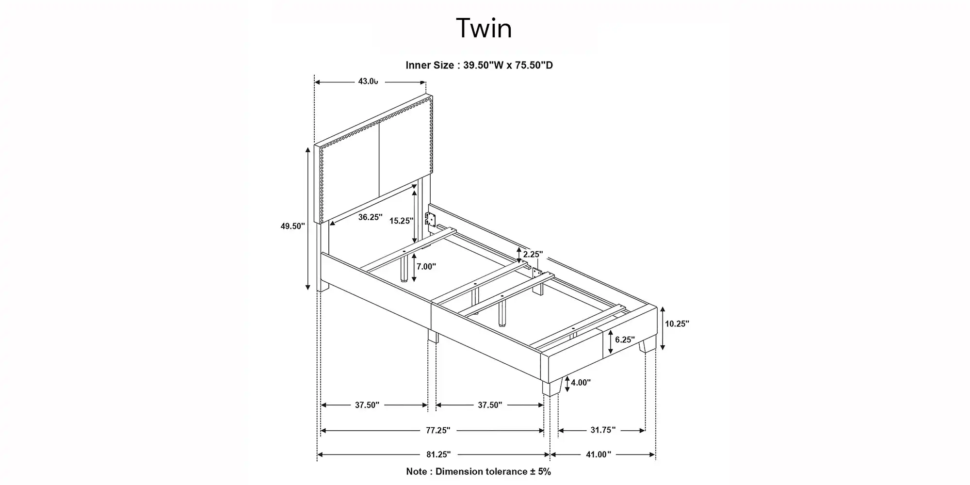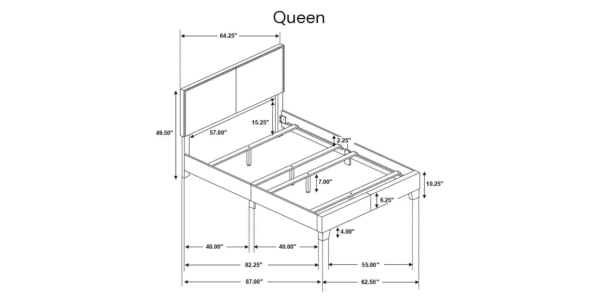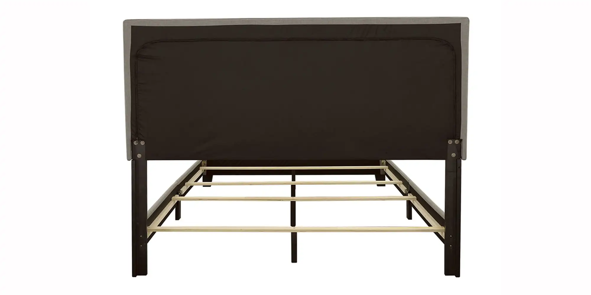 Embrace a relaxed modern style with the smooth edges from this upholstered bed frame. Complete with solid wood legs in black finish, the open frame warms up spaces with simplicity. Chic and individually placed, the chrome nailhead trim adds pops of metallic radiance along the fabric-covered headboard. Constructed of smooth rectangles, the open silhouette feels calm and welcoming. Neutral and soft hues ensure that traditional and contemporary design schemes are maintained.