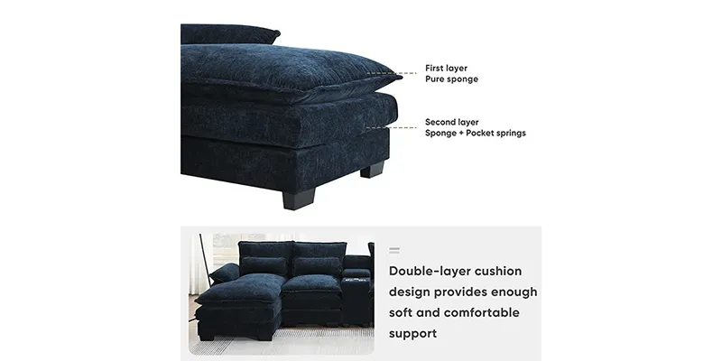 • Double cushion: Provide a softer and more comfortable wrap-around feeling.The top cushion is filled with pure high density foam for a softer feeling,the lower cushion is filled with pocket springs with high density foam for better support.