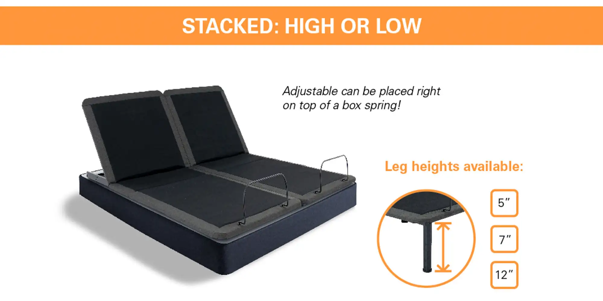 • Adjustable 5″ to 12″ leg height