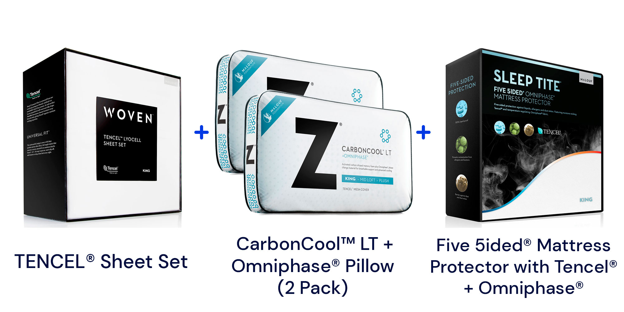 Introducing our Cooling King Bundle, designed to provide the ultimate cooling comfort for your king-size bed. Customize your bedding with our TENCEL® Sheet Set, available in four elegant colors known for their breathability and moisture-wicking properties. Experience unparalleled cooling with the CarbonCool-LT-Omniphase Pillow, featuring innovative technology to regulate temperature and promote airflow for a refreshing sleep experience. Plus, protect your mattress with our Fine 5ided Mattress Protector, enhanced with Tencel ®and Omnihase® technology to ensure advanced moisture control and allergen resistance. Upgrade to the Cooling King Bundle for unrivaled comfort and coolness every night.