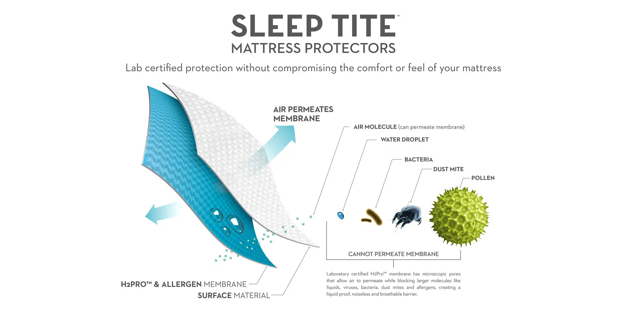 The patented Encase® HD mattress protector offers complete encasement protection from bed bugs, dust mites, and liquids. Its laboratory-certified Micro Tite® zipper closure is bed bug proof and allows for easy removal as the top half zips completely off. Also laboratory-certified, the H2Pro® membrane creates a quiet, liquid-proof and breathable barrier against allergens, dust mites, and liquids. Pillow protectors are available to create a healthy sleeping environment.