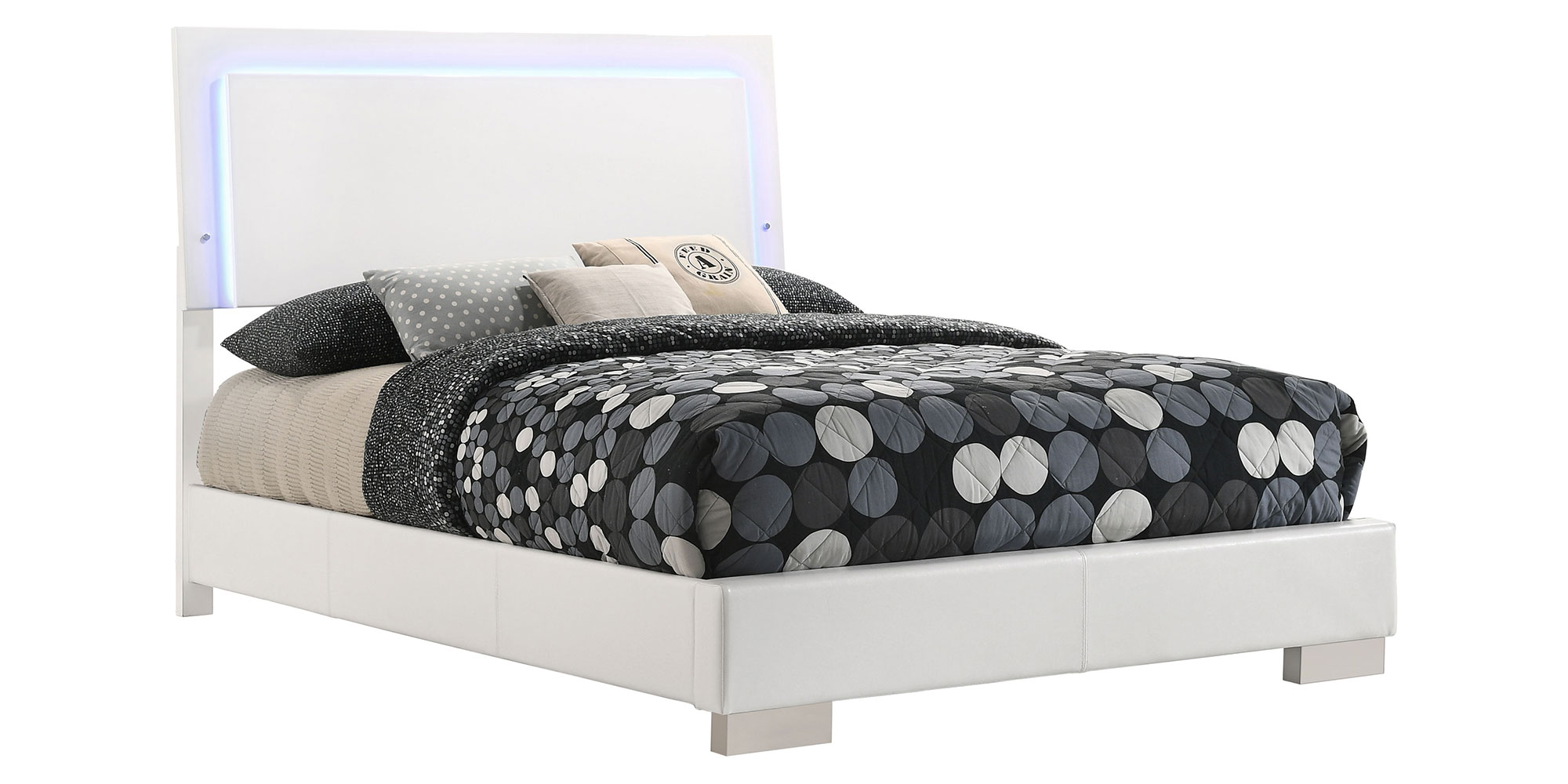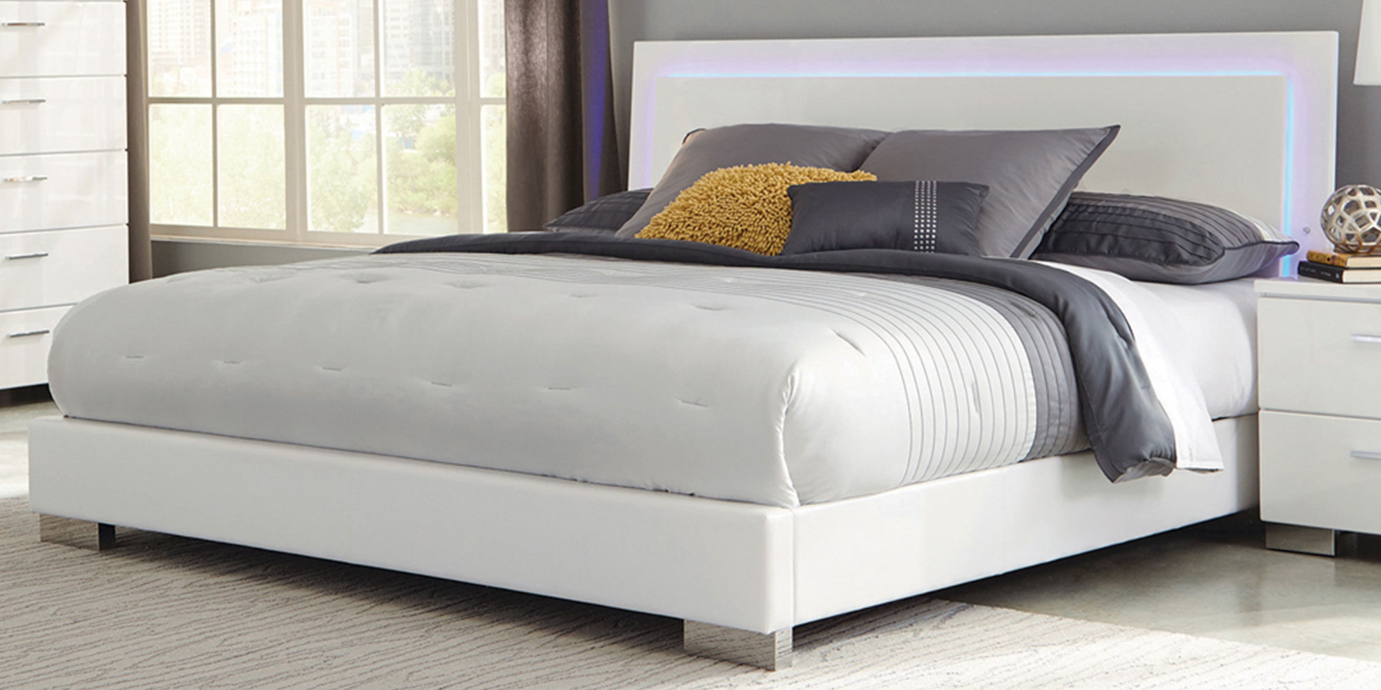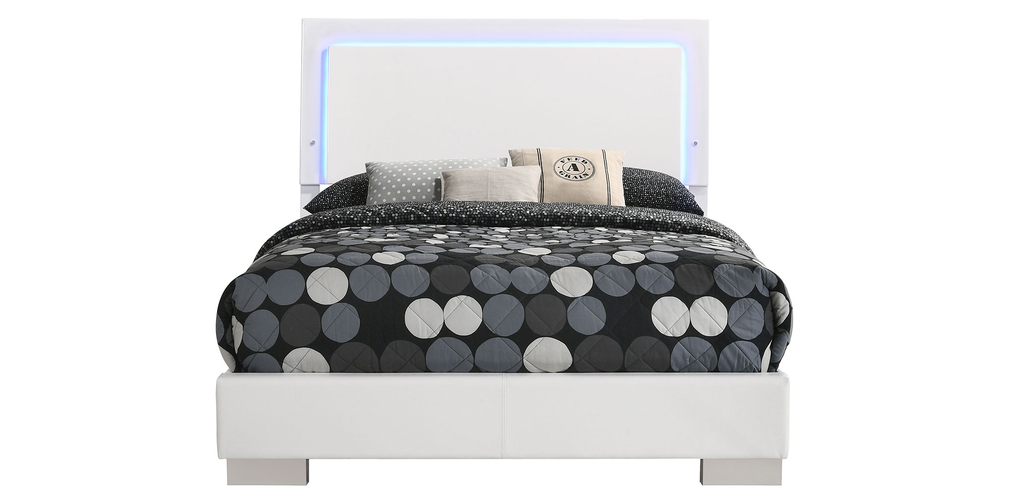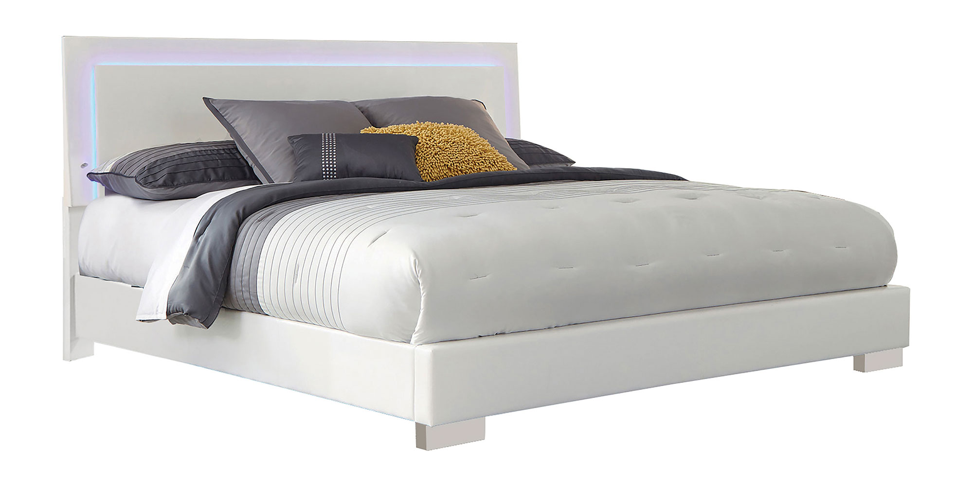 Cosmopolitan style infiltrates a favored bedroom. With a total mod and glam personality, this stylish bed is Fully contemporary. Enjoy a low-profile with a white coated and polished glossy finish. Blue LED lighting radiates from its headboard to aid in reading without glare. Style a fresh, elegant room with this spectacular bed.