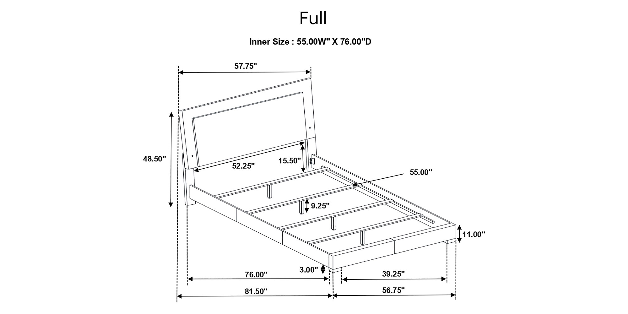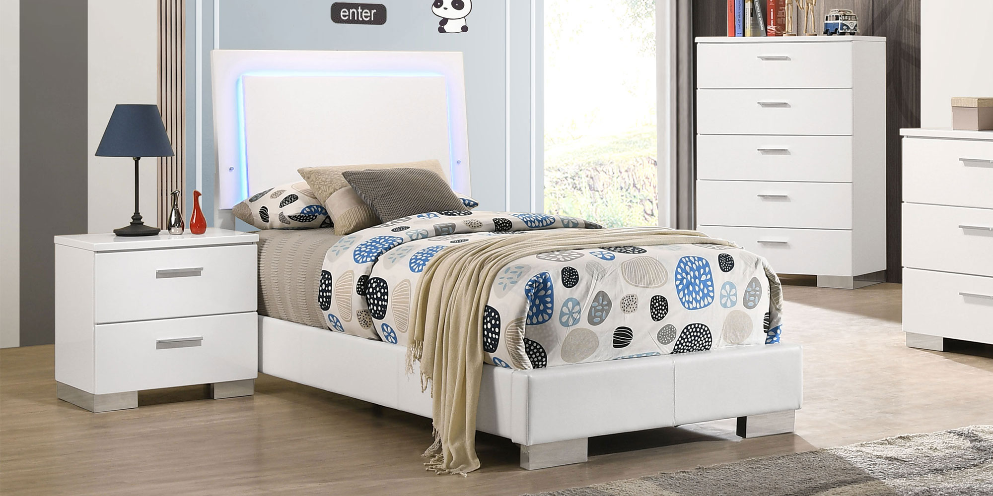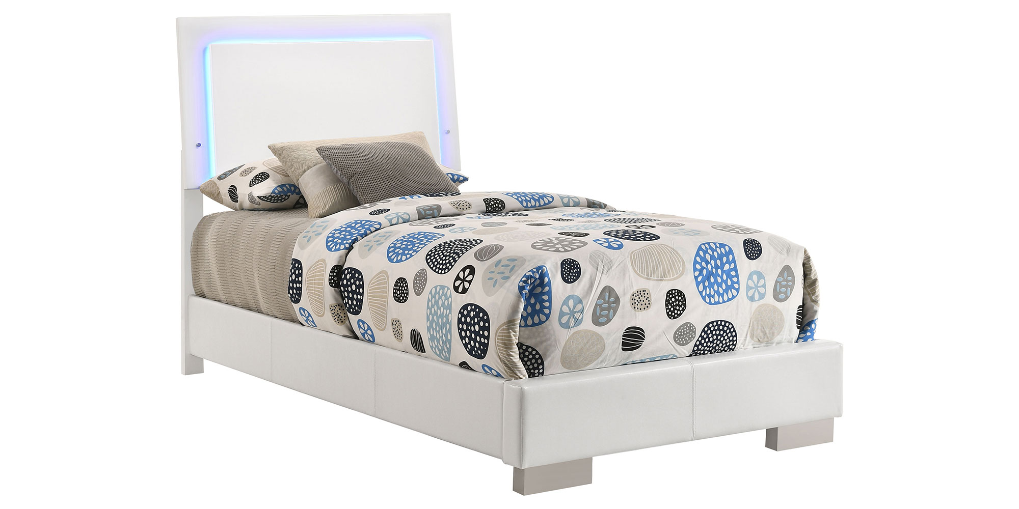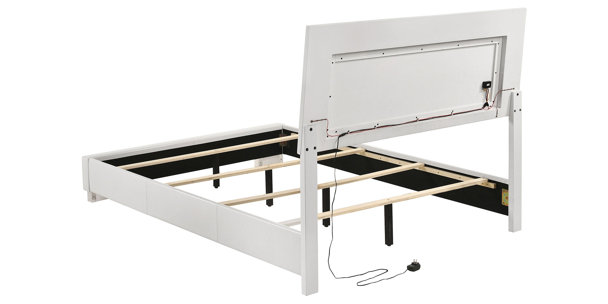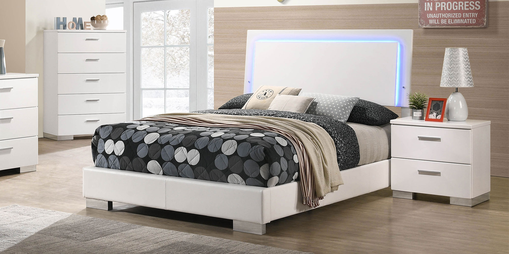 Cosmopolitan style infiltrates a favored bedroom. With a total mod and glam personality, this stylish bed is Fully contemporary. Enjoy a low-profile with a white coated and polished glossy finish. Blue LED lighting radiates from its headboard to aid in reading without glare. Style a fresh, elegant room with this spectacular bed.