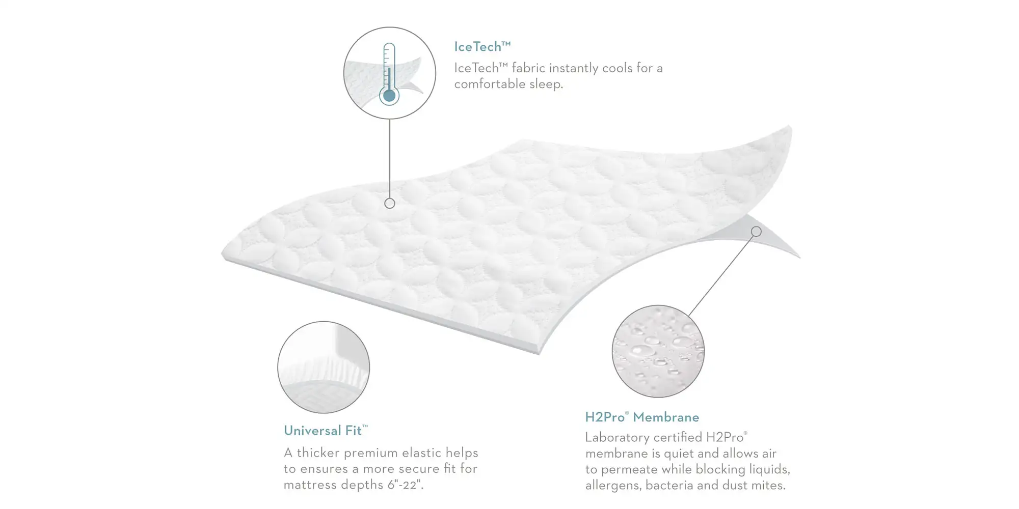 The Five 5ided® IceTech™ Mattress Protector offers reliable waterproof protection and cooling technology. Innovative IceTech™ fabric continually dissipates body heat for a comfortable sleep climate. The lab-certified H2Pro® barrier protects the top and sides of mattresses from fluids, stains, dust mites and allergens while allowing air to permeate for comfortable breathability. Fitted protector has a Universal Fit™ design with deep pockets and a premium 1.5″ elastic in the skirt hem for a smooth, secure fit on mattress depths from 6″ to 22″.