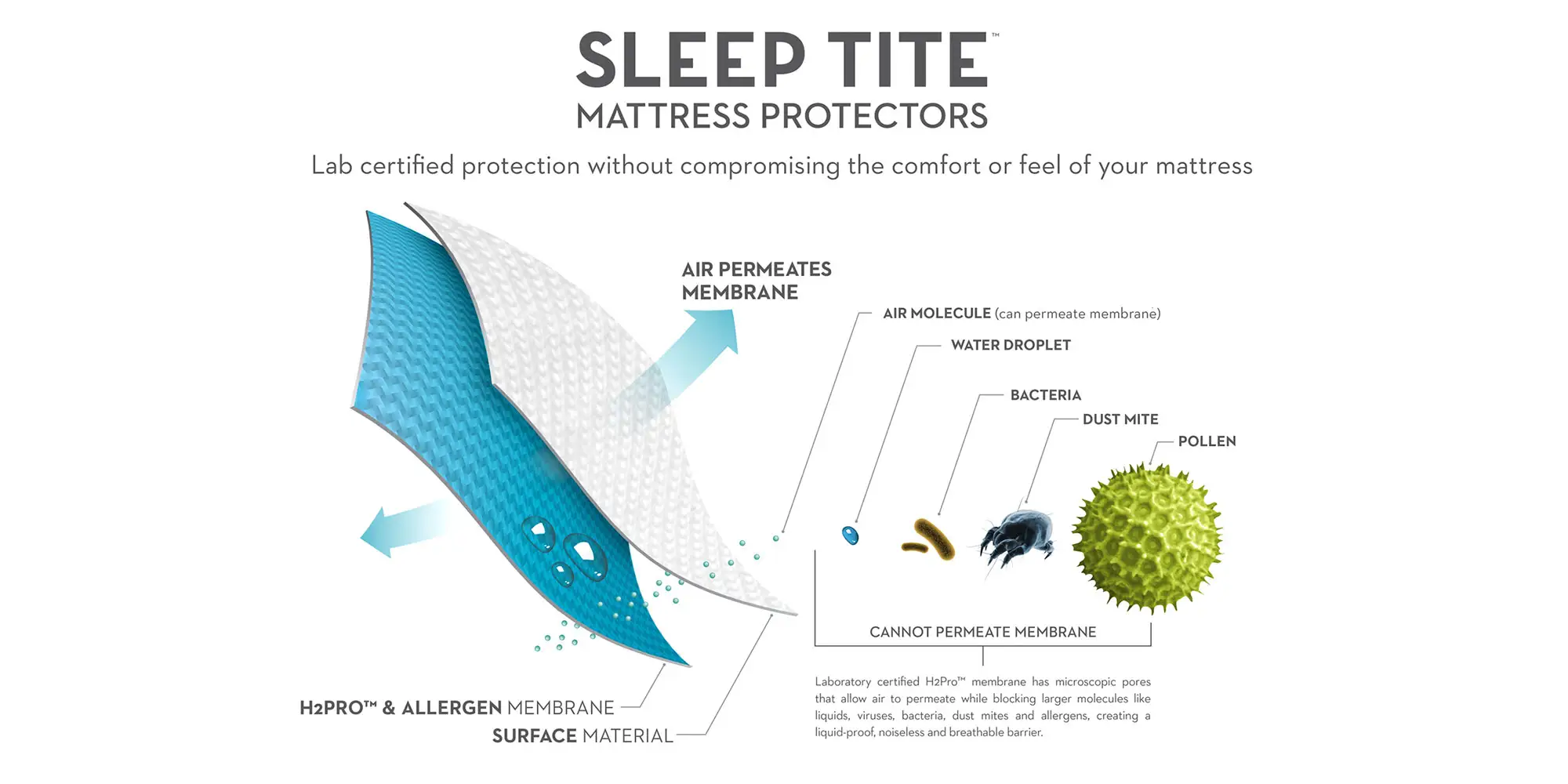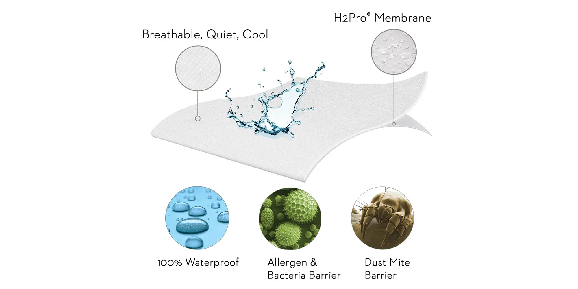 The Five 5ided® Mattress Protector with Tencel® + Omniphase® is the most advanced mattress protector on the market with three incorporated technologies—Tencel®, Omniphase®, and the H2Pro® membrane. Omniphase® phase change material promotes a comfortable sleeping temperature in any climate; Tencel® fiber wicks away moisture from the body and the laboratory-certified H2Pro® liquid-proof membrane creates a quiet, and breathable barrier against allergens and dust mites. The combined benefits of these technologies means you will sleep comfortably and dry with five sides of protection for your mattress. Pillow protectors are also available to create a healthy sleeping environment.