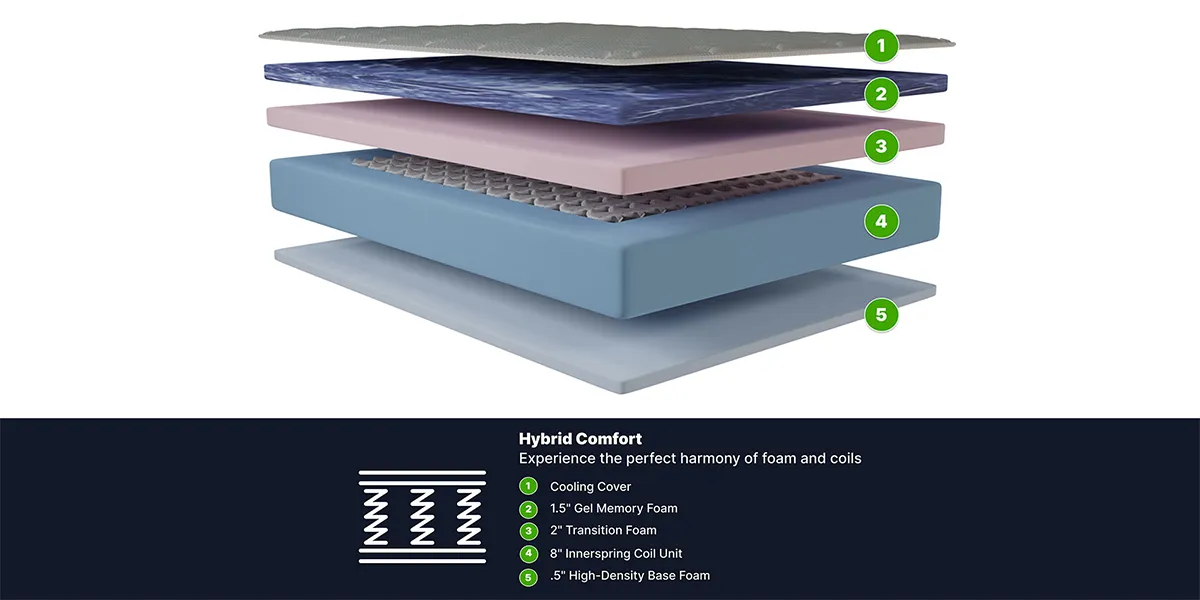 • All-Night Cooling – Naturally cooling gel memory foam combines with airflow-enhancing coils for a more comfortable sleep environment.
