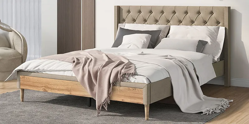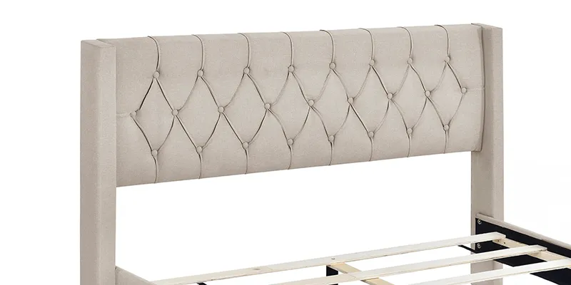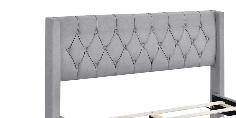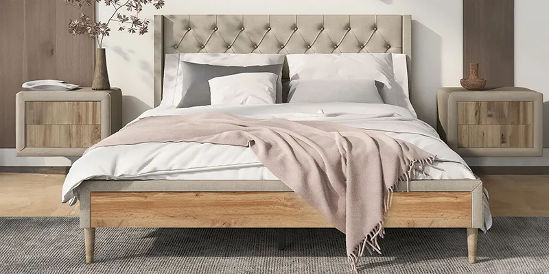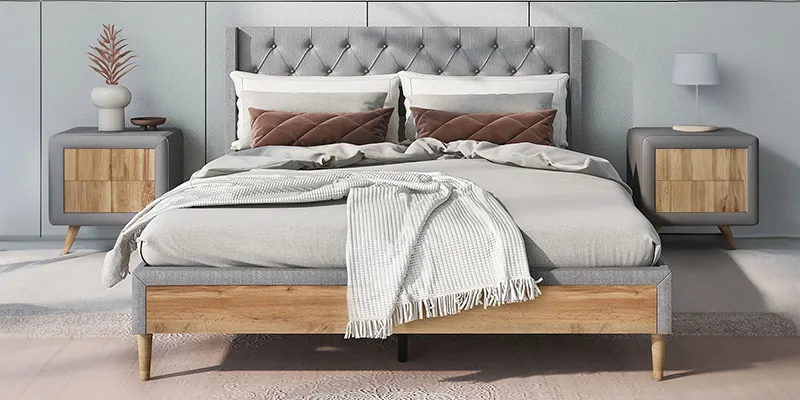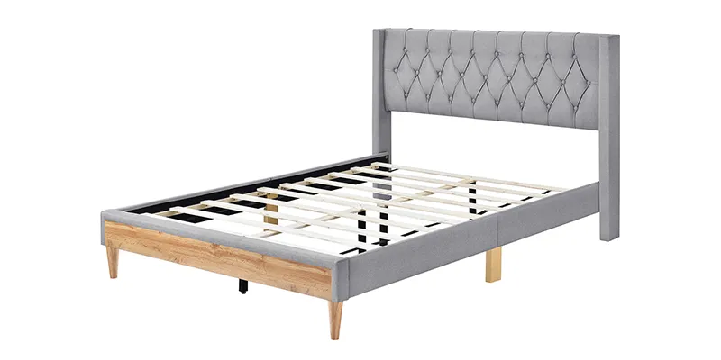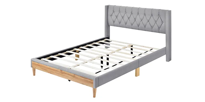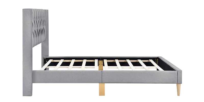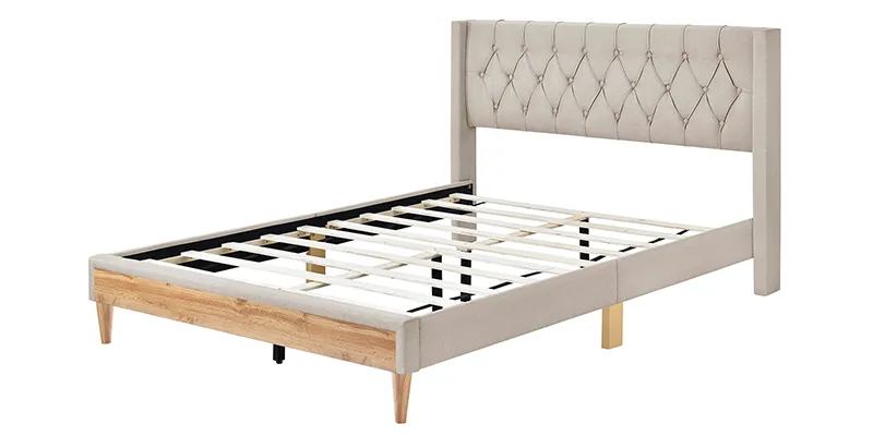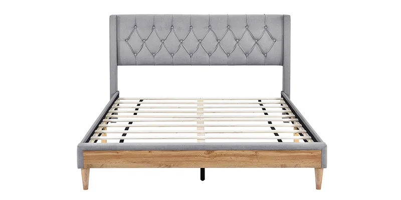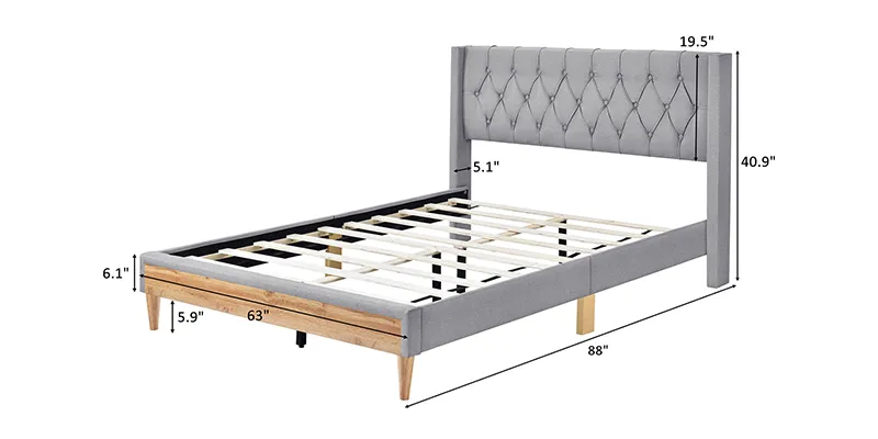 This beautiful Upholstered Platform Bed features button tufted upholstered headboard that adds a contemporary chic look to your bedroom and filled in thick foam to add extra comfort.Sturdy wood frame construction and the rubber wood legs to add extra stability and safety. Despite its size and solidity, this piece comes with hardware and instructions included and anyone can assemble it, without a problem. The combination of linen and wood grain surfaces is elegant and original.