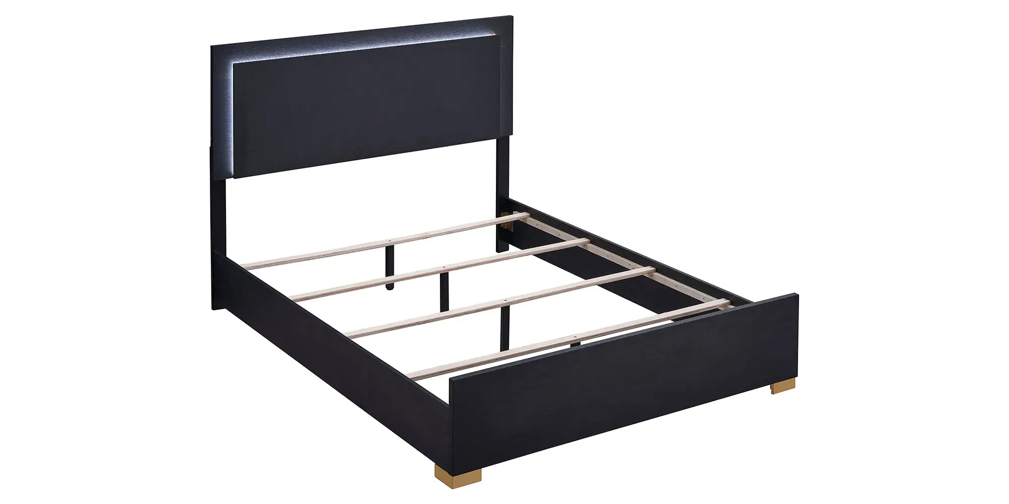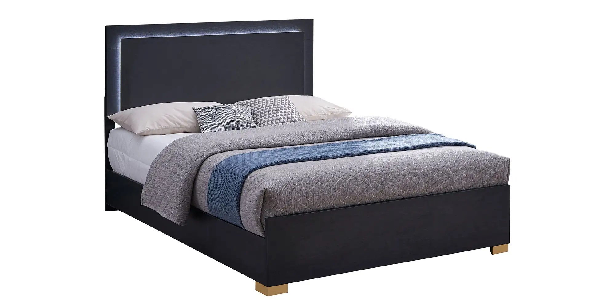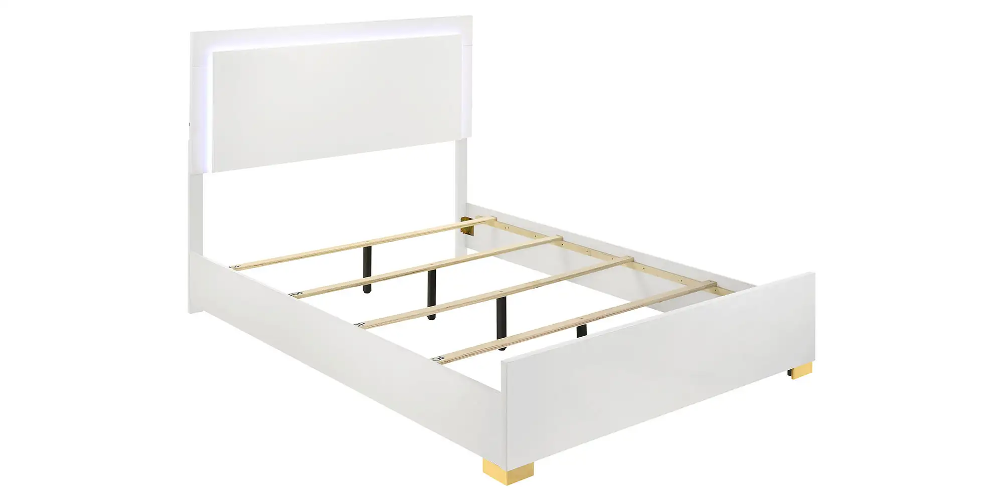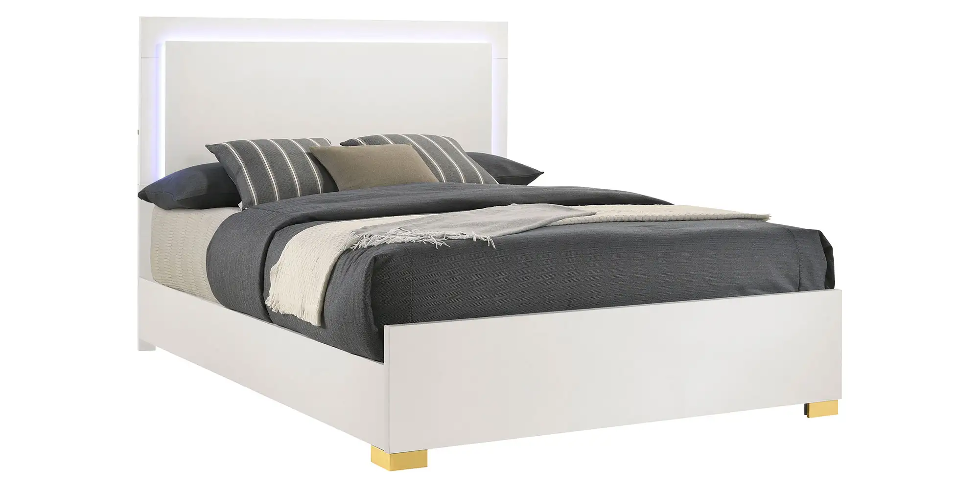 Explore the possibilities of modern features that render this chic bed a haven for relaxation and a comfy place to sleep and lounge. A stylish yet minimalist design feature is perfect for anchoring your contemporary bedroom. Assembled of wood products and melamine laminate, it offers updated and sturdy construction. Ethereal energy-efficient lighting frames its tall headboard, operated with a touch mechanism through headboard-mounted buttons. Gleaming gold metal finish feet are petite yet noticeable.