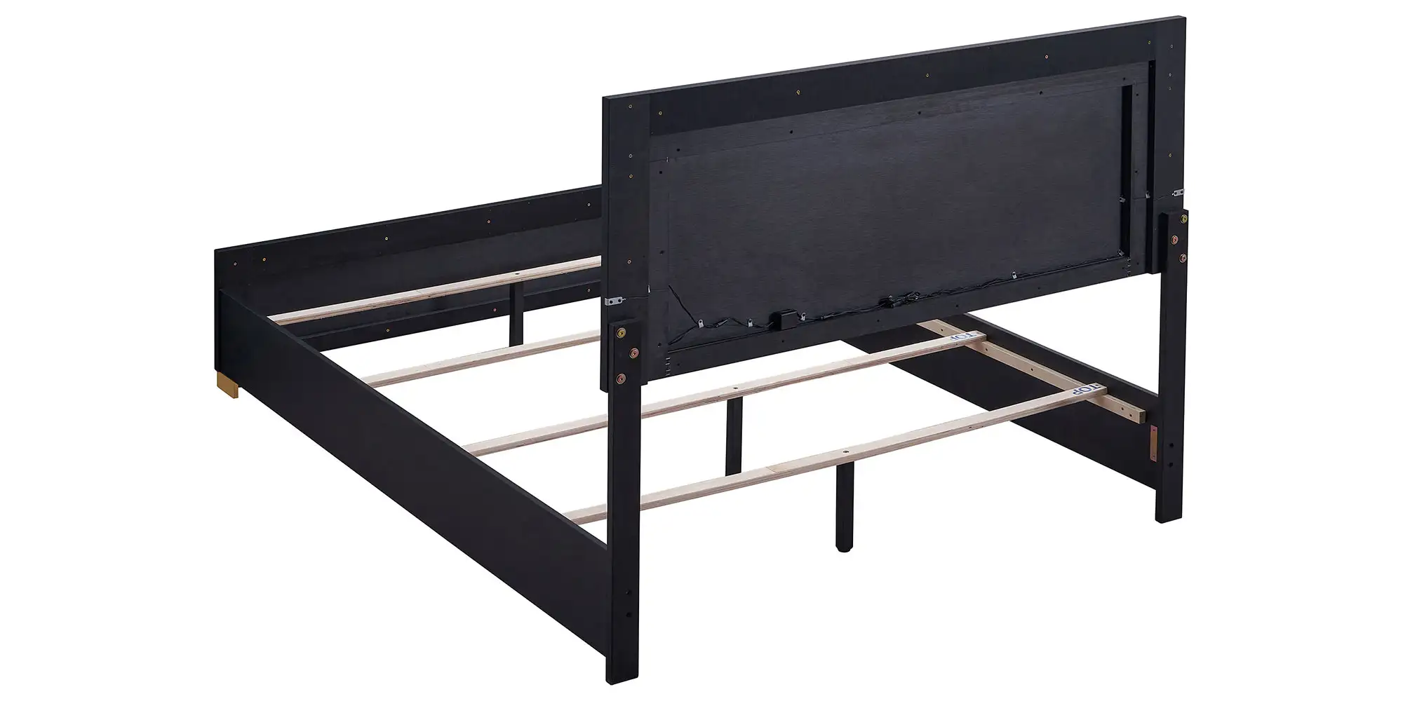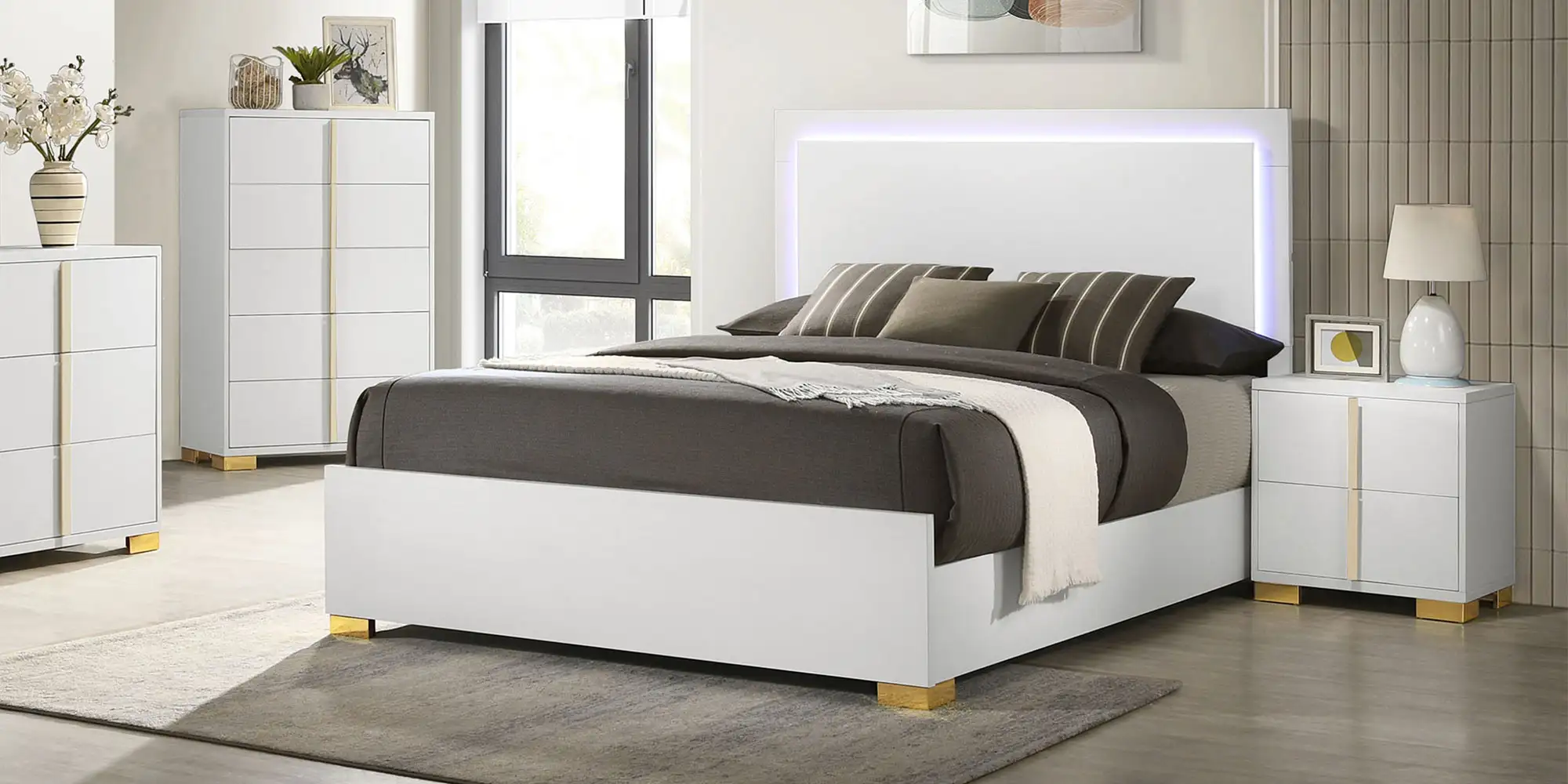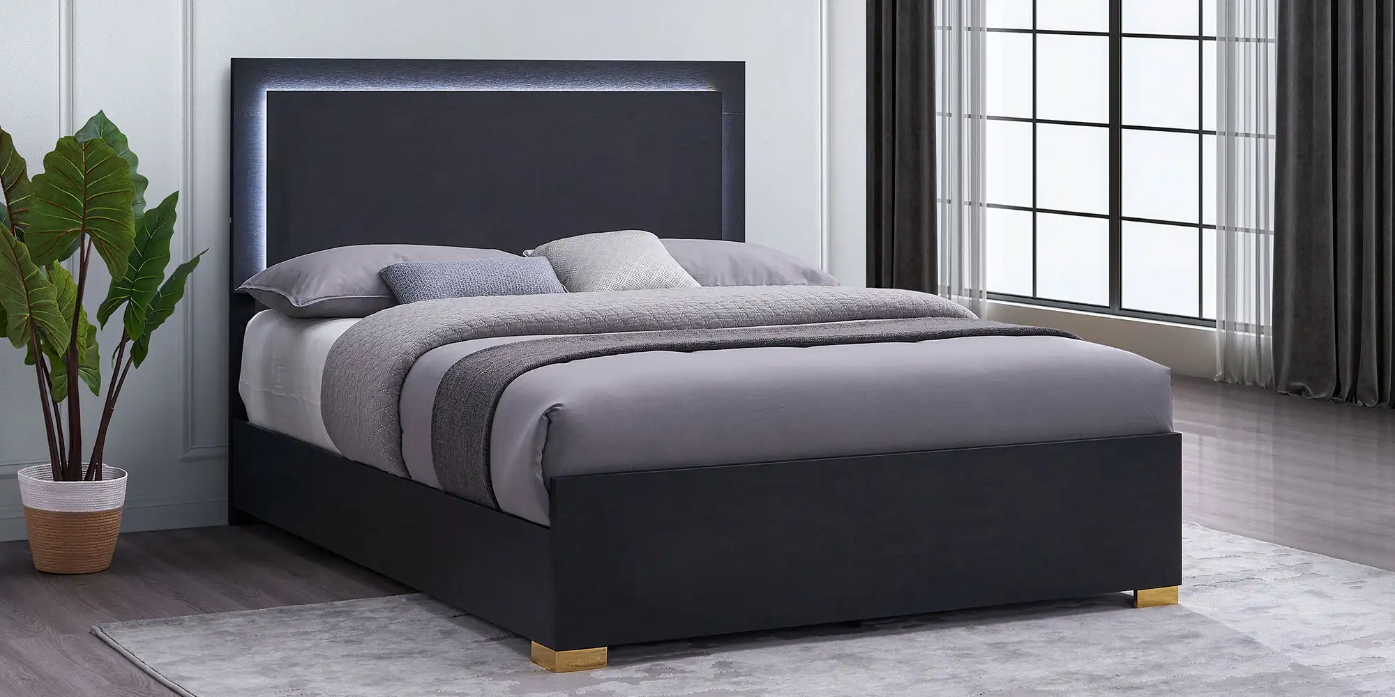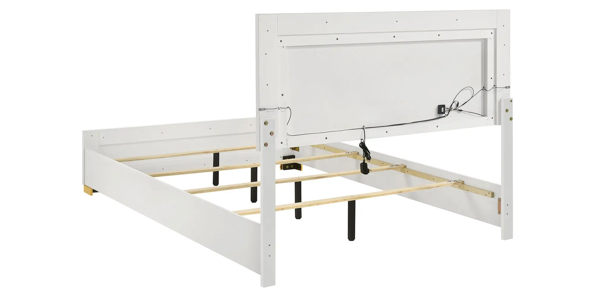 Explore the possibilities of modern features that render this chic bed a haven for relaxation and a comfy place to sleep and lounge. A stylish yet minimalist design feature is perfect for anchoring your contemporary bedroom. Assembled of wood products and melamine laminate, it offers updated and sturdy construction. Ethereal energy-efficient lighting frames its tall headboard, operated with a touch mechanism through headboard-mounted buttons. Gleaming gold metal finish feet are petite yet noticeable.