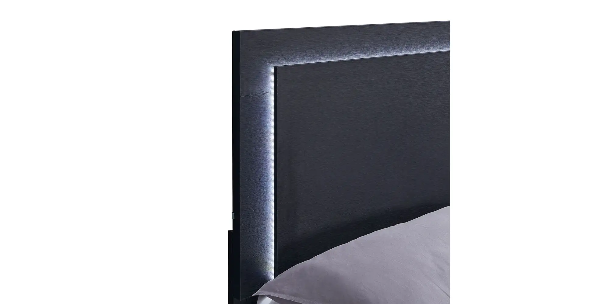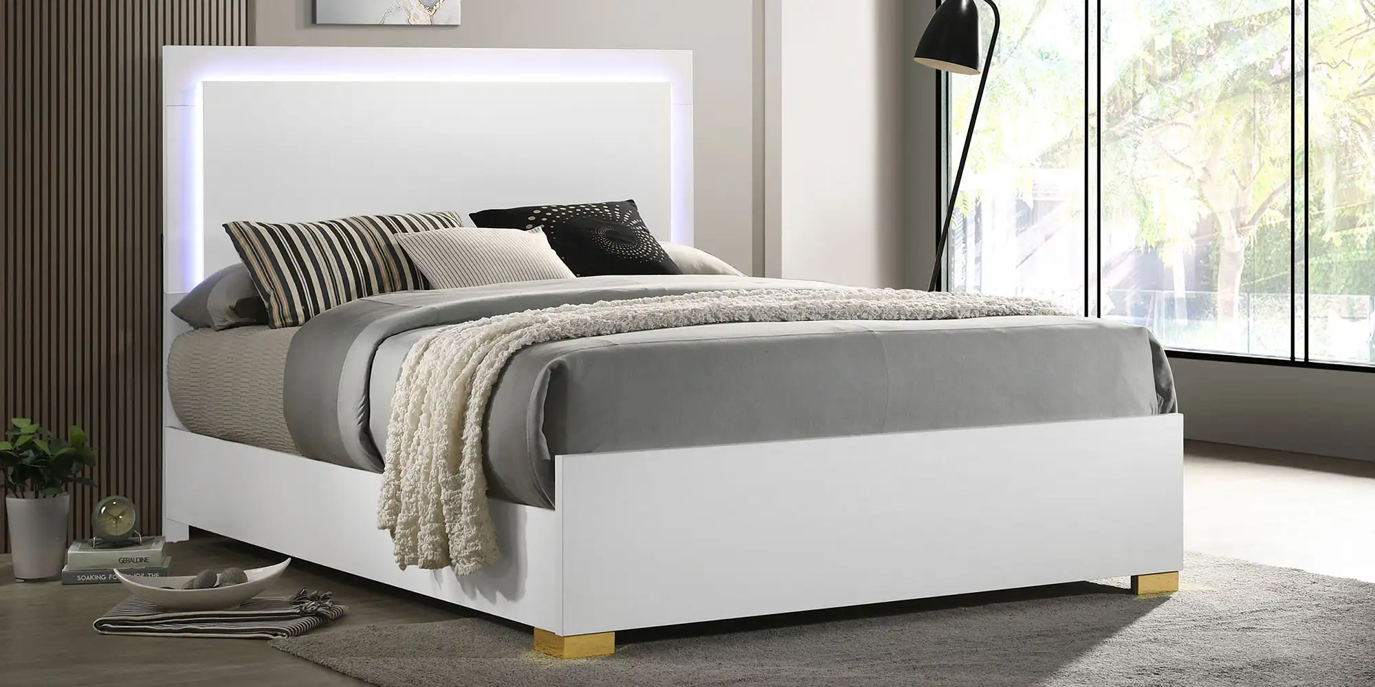 • Enjoy the ethereal ambiance created by energy-efficient lighting framing its tall headboard, easily controlled through headboard-mounted touch buttons