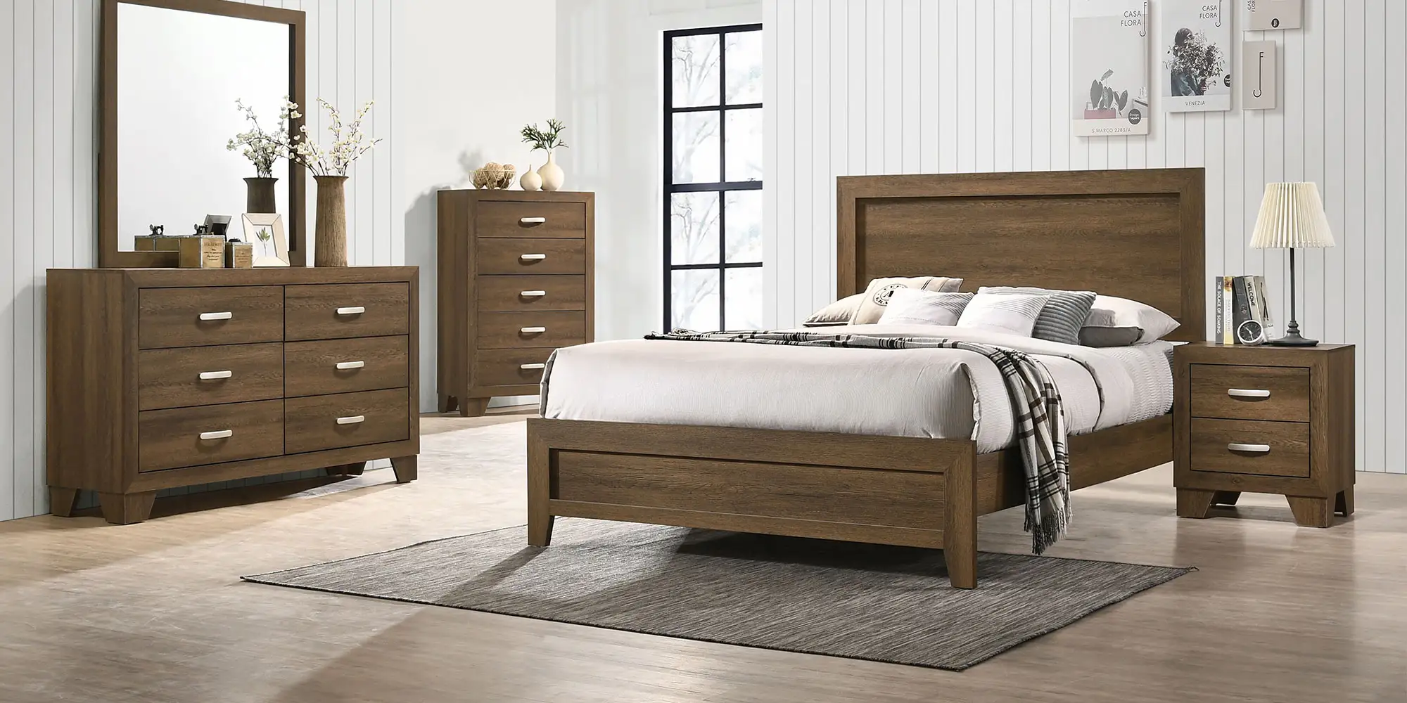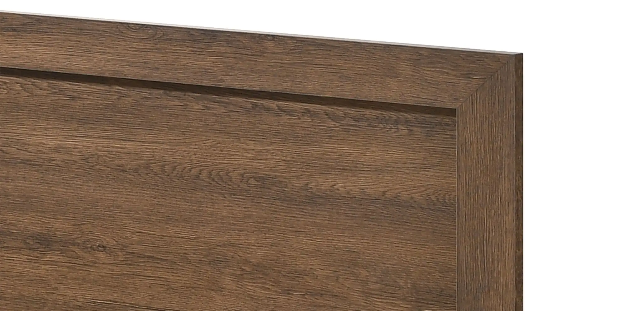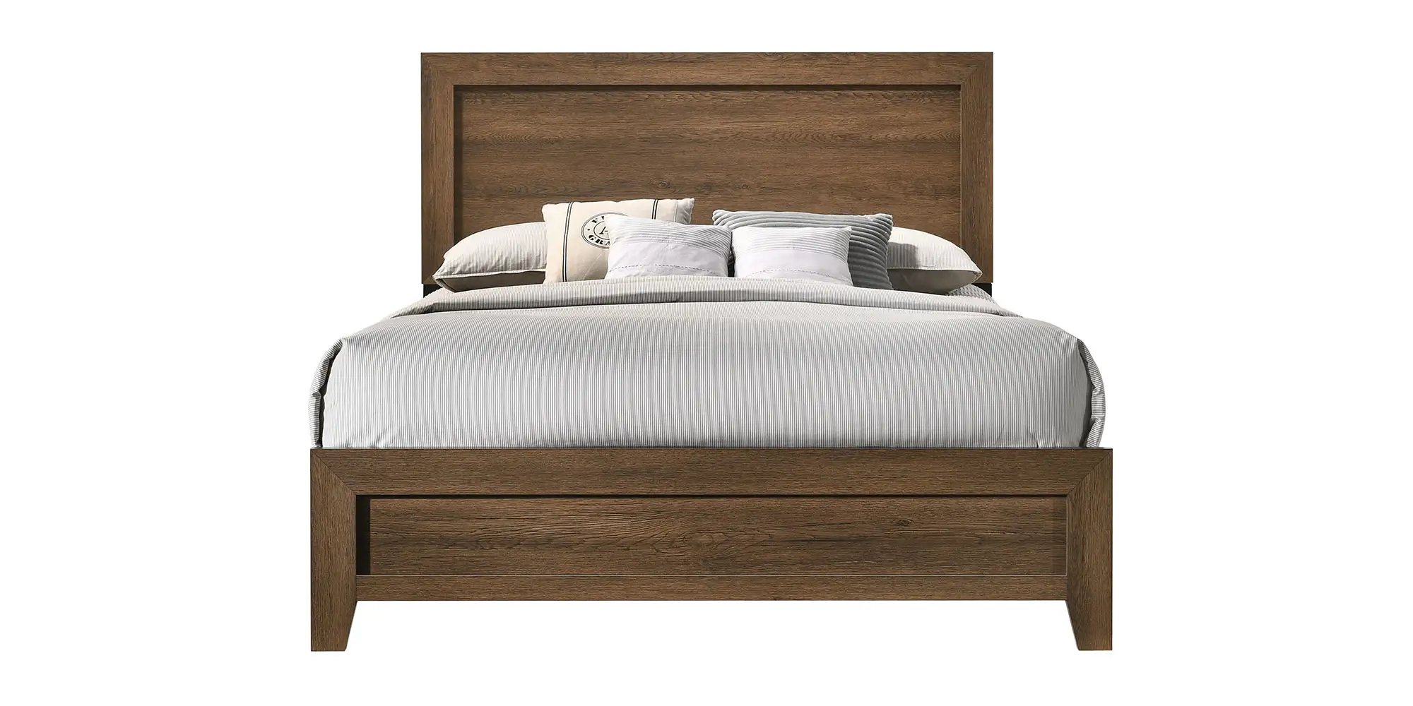 The Miquell bedroom collection provides a commanding presence in any bedroom. This contemporary panel bed features a rectangular headboard with a low profile footboard and tapered legs. All expertly crafted with a transitional look that is an ideal addition to any bedroom. This fashionable bed will fuse with the surrounding decor and accent your other bedroom furniture, transforming a room from ordinary into something interesting and sophisticated.