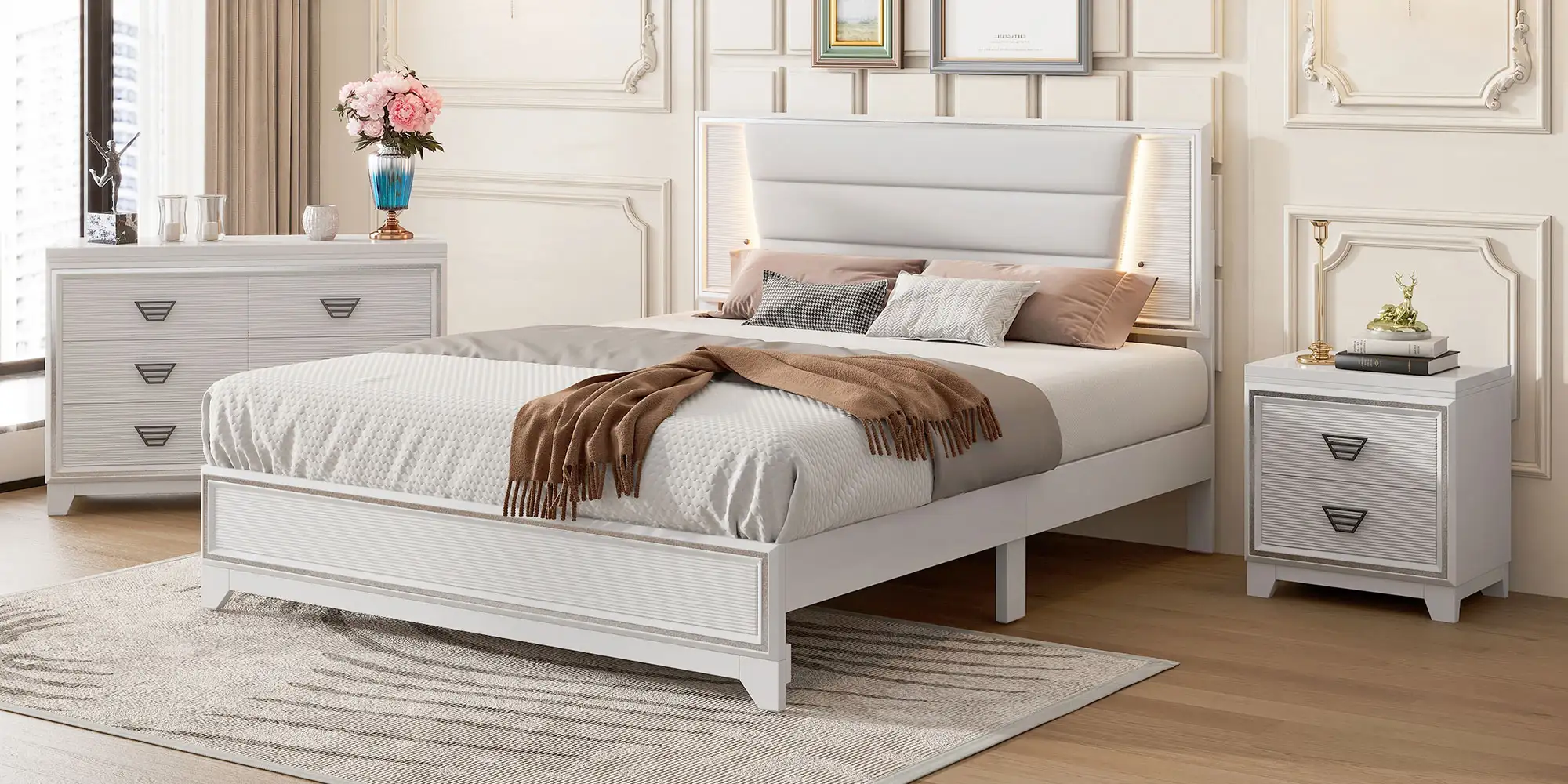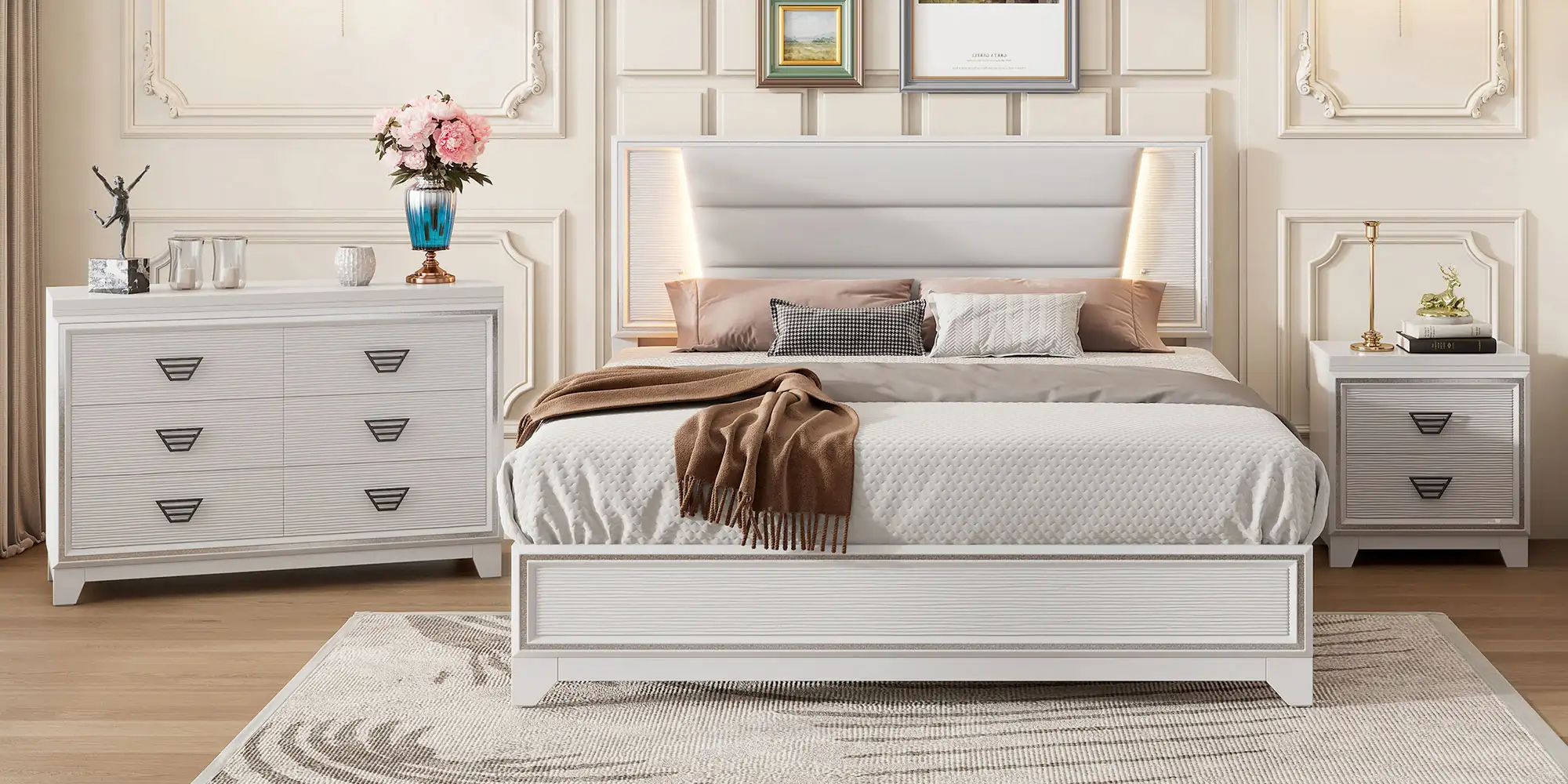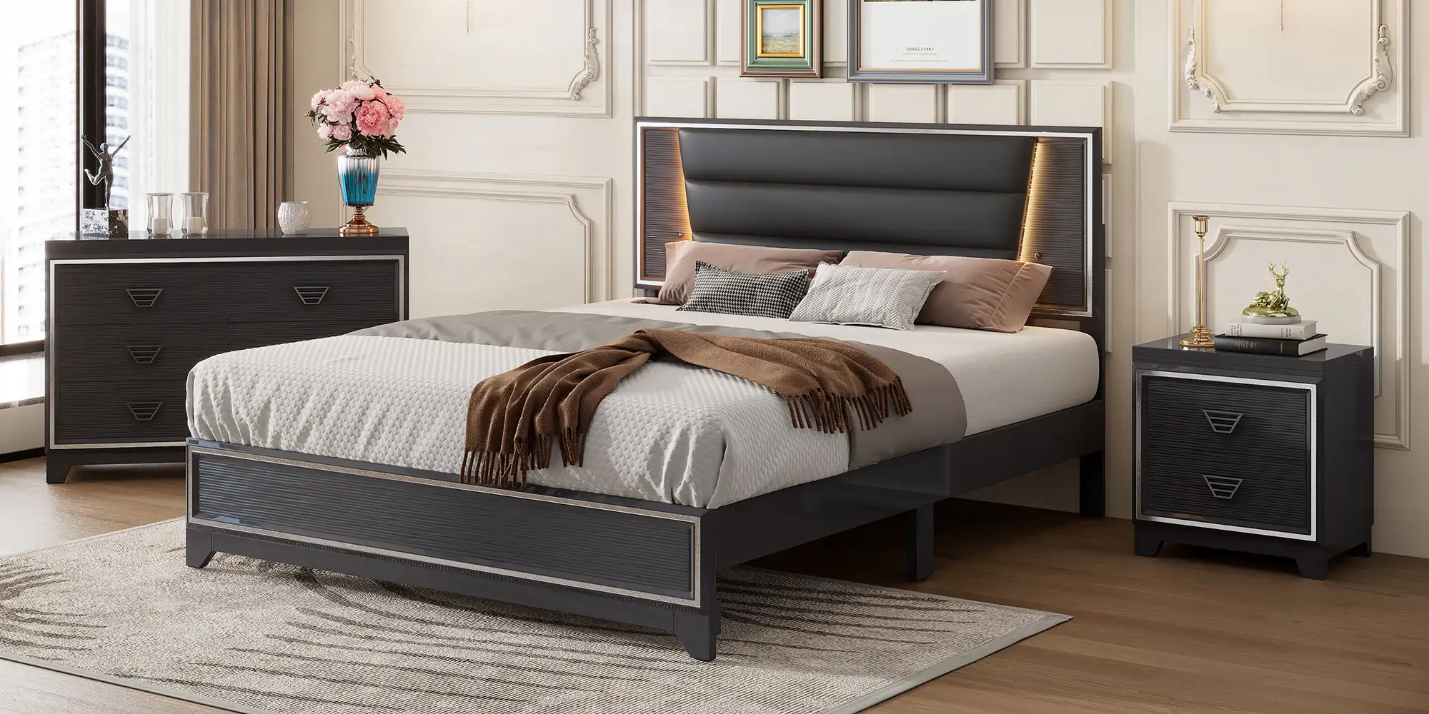 • [3-Pieces Perfect Bedroom Set] 1 queen size bed + 1 bedside tables + a chest of drawers. The modern and stylish design fits the decoration style of most families. Sparkling shiny Decoration+ LED lights create a warm sleeping environment.