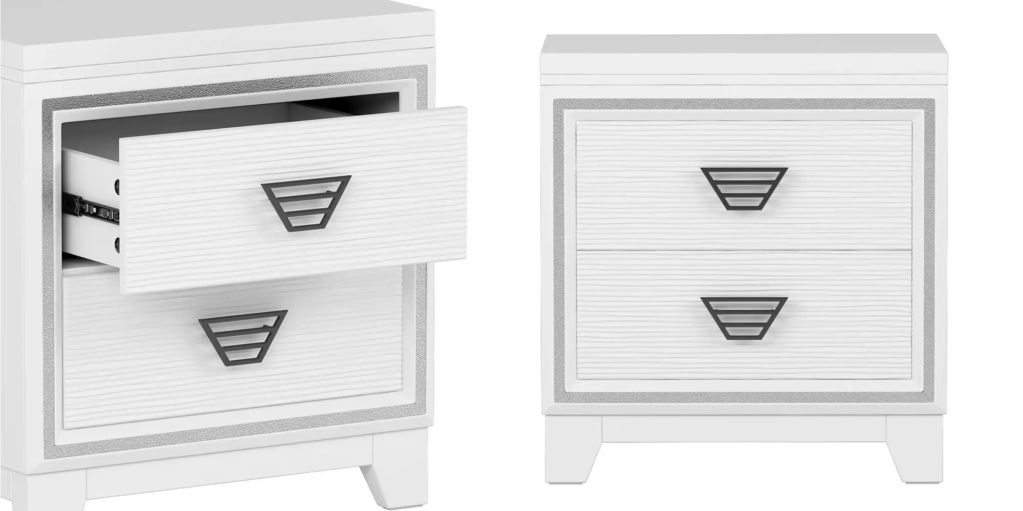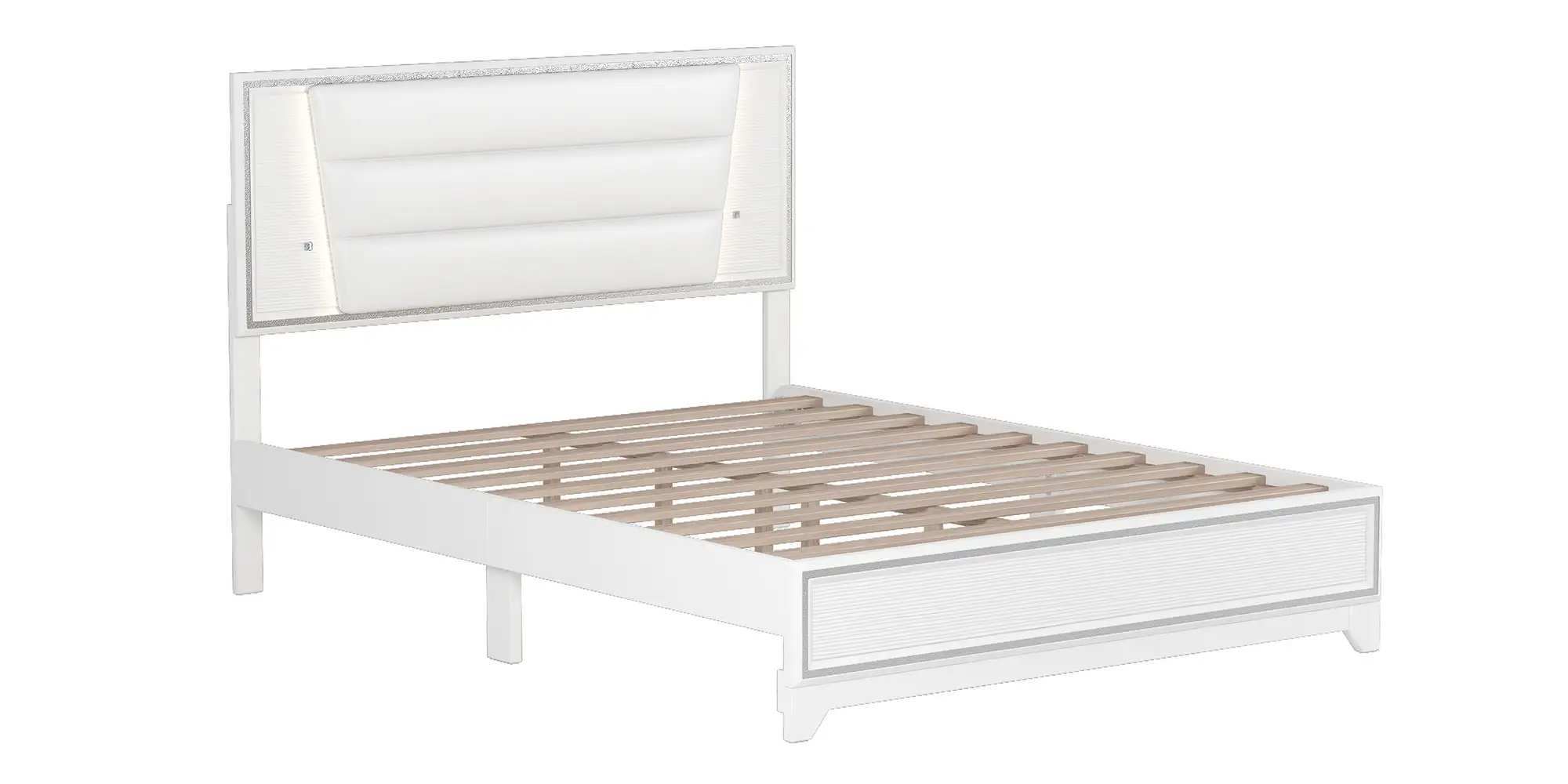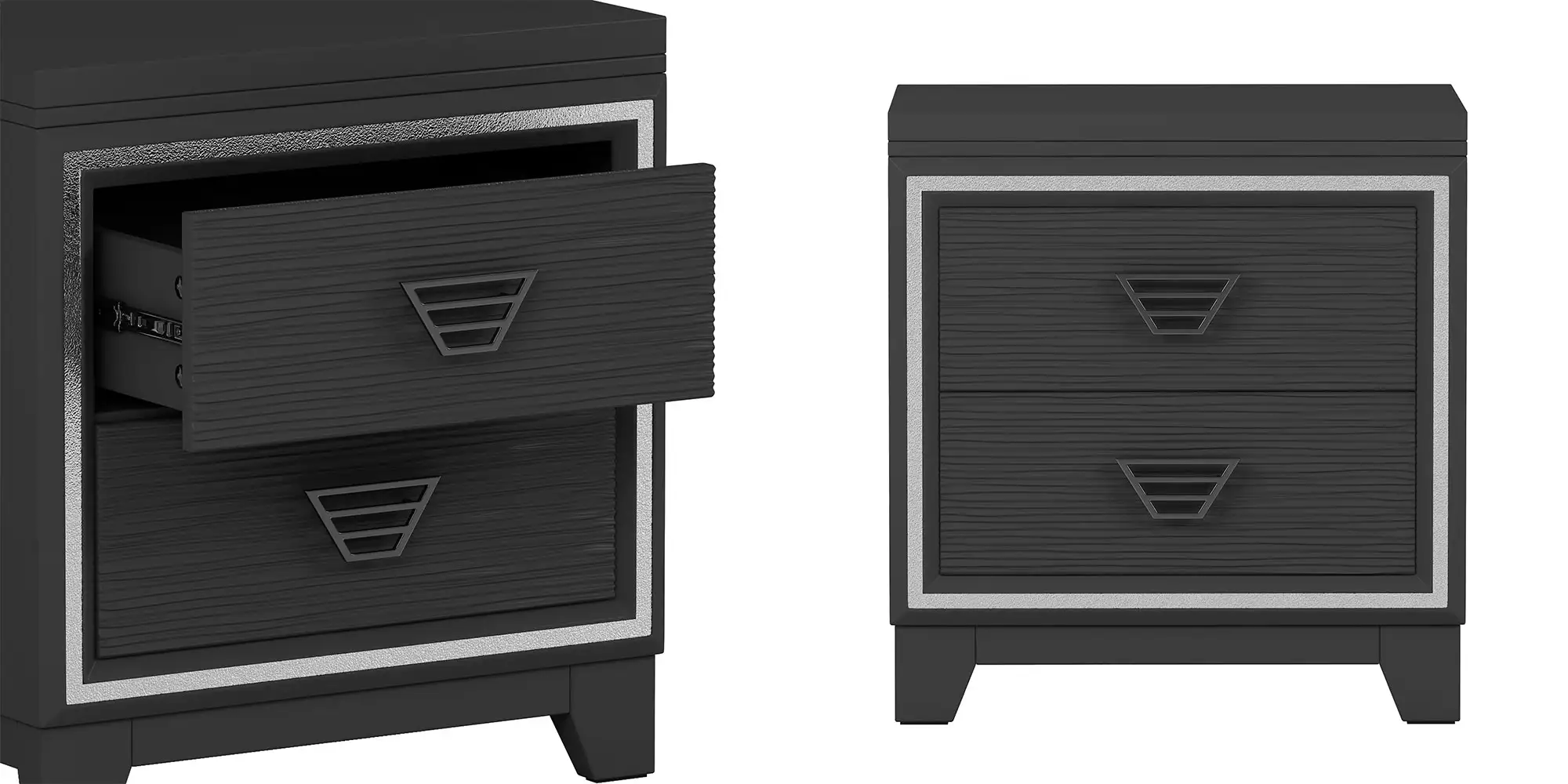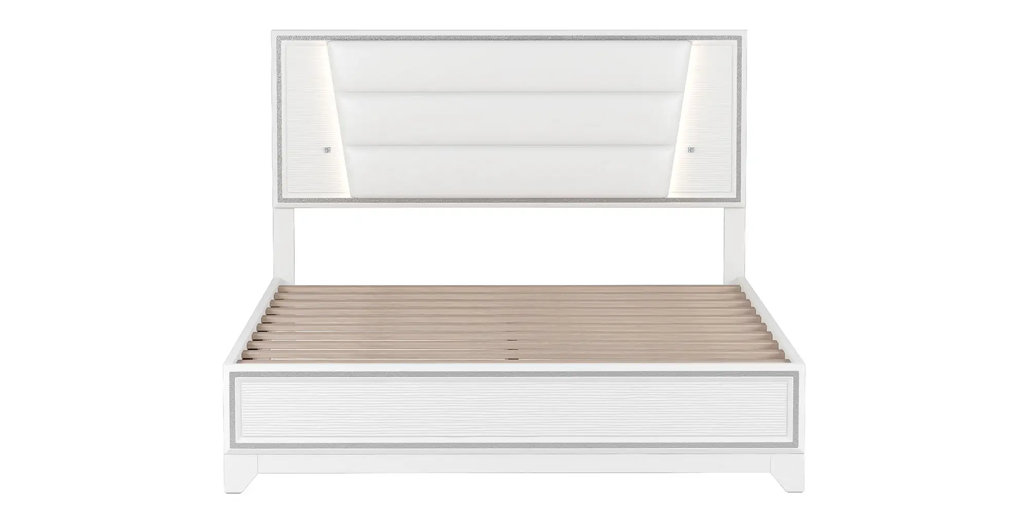 • [3-Pieces Perfect Bedroom Set] 1 queen size bed + 1 bedside tables + a chest of drawers. The modern and stylish design fits the decoration style of most families. Sparkling shiny Decoration+ LED lights create a warm sleeping environment.
