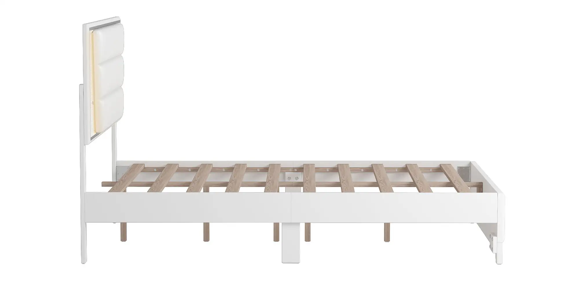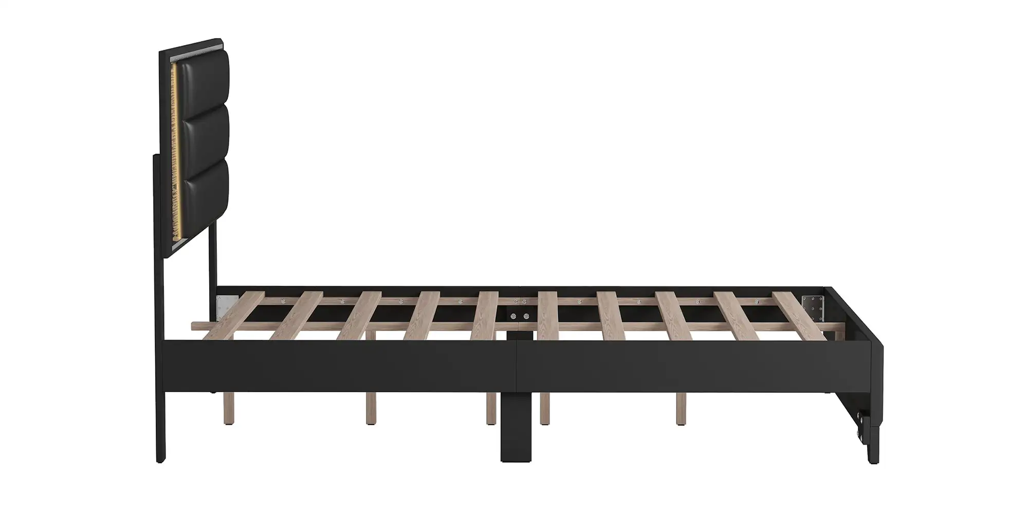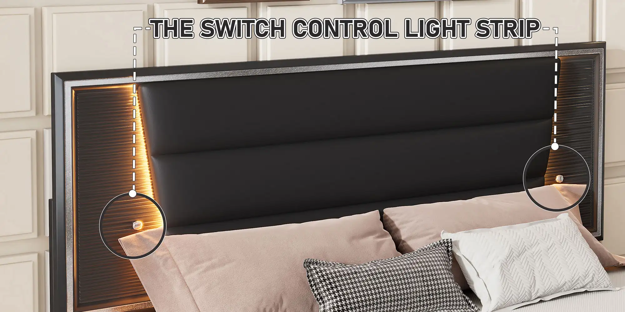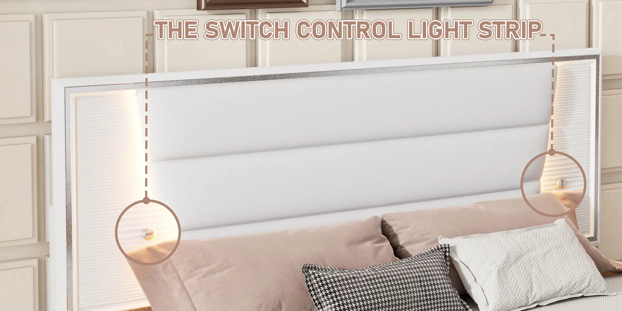 Queen upholstered Platform Bed features LED lights headboard that adds a contemporary chic look to your bedroom and sparkling shiny decoration adds extra fashion. The nightstand fits in many locations throughout your home and also can be used as an end table in living room. The metal handles create a unique sense of space. Organize your nighttime essentials with this dresser, featuring 6 drawers for clutter-free storage to save your space. Modern style and versatility for many occasions, from large bedrooms to small apartments.