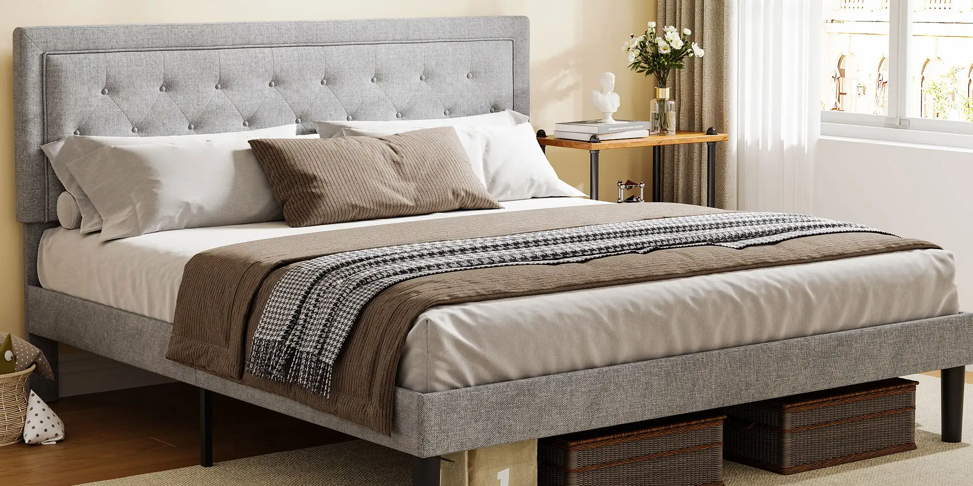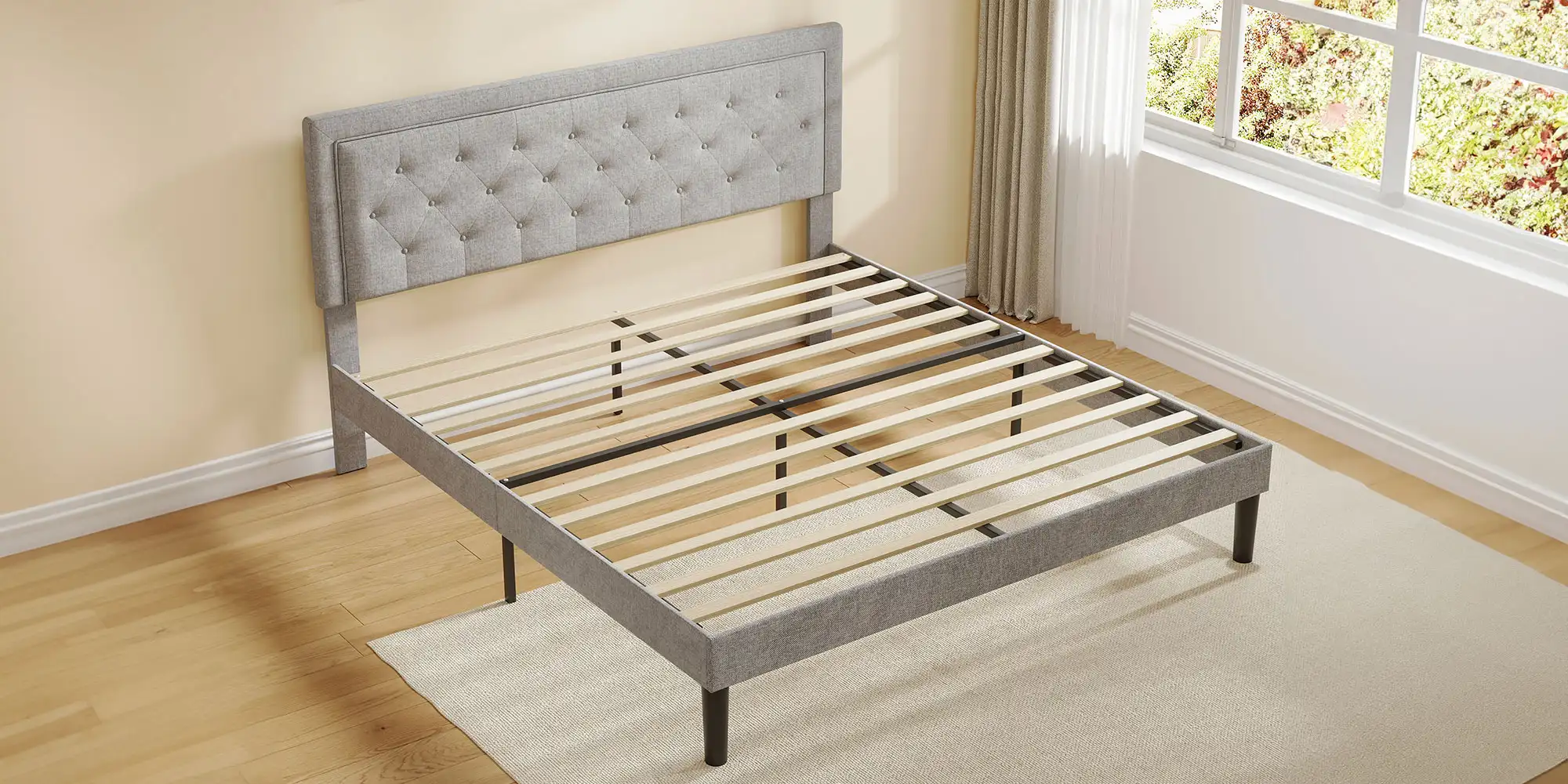 Maximum load capacity up to 705 lbs. The bed frame is noiseless and equipped with plastic mats to protect the floor.