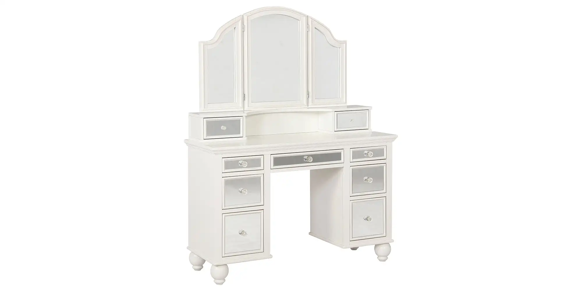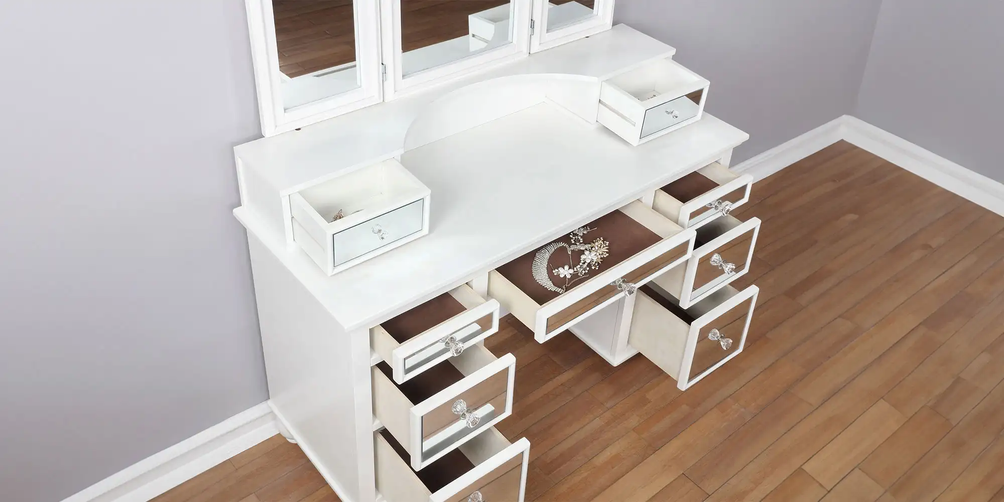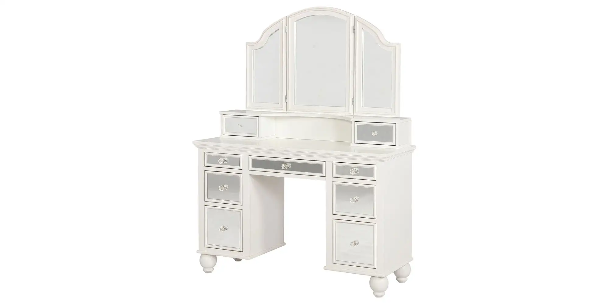 • Features a tri-fold mirror, hutch with two drawers, and table with seven felt lined drawers