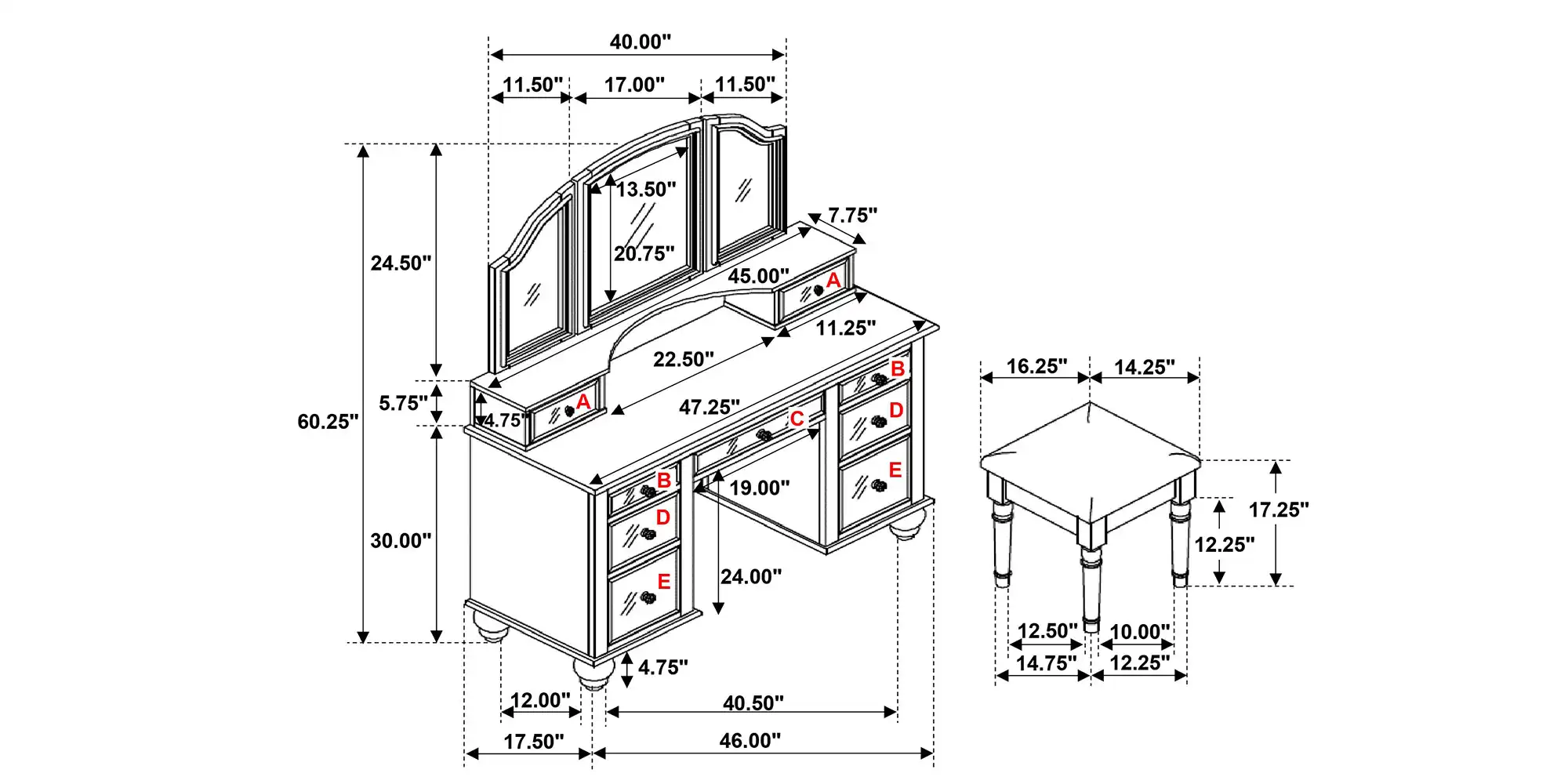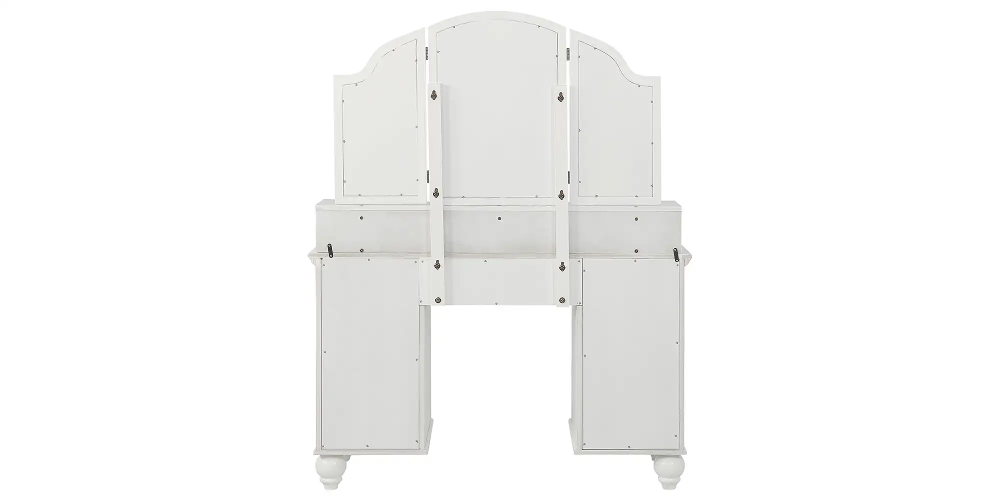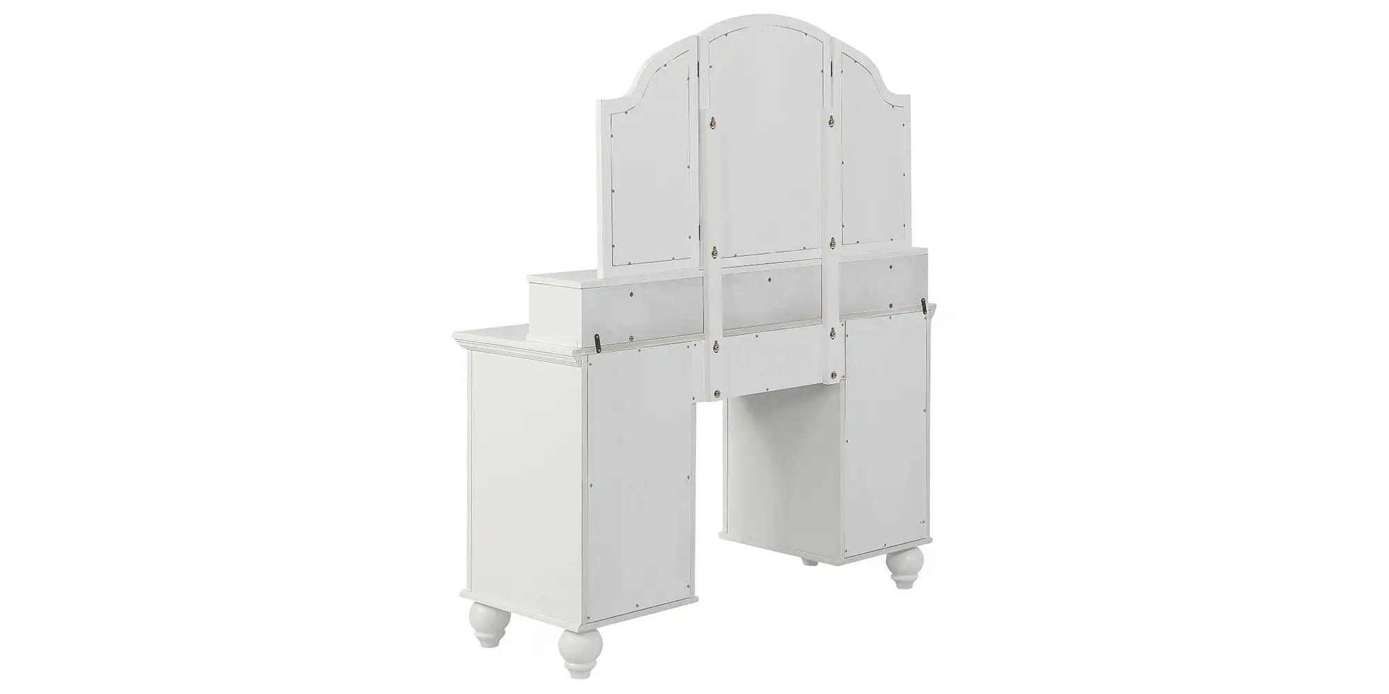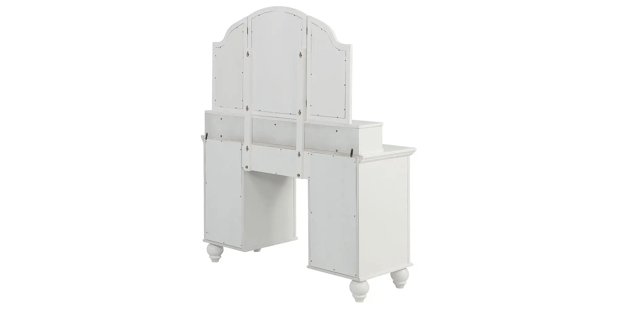 • Features a tri-fold mirror, hutch with two drawers, and table with seven felt lined drawers