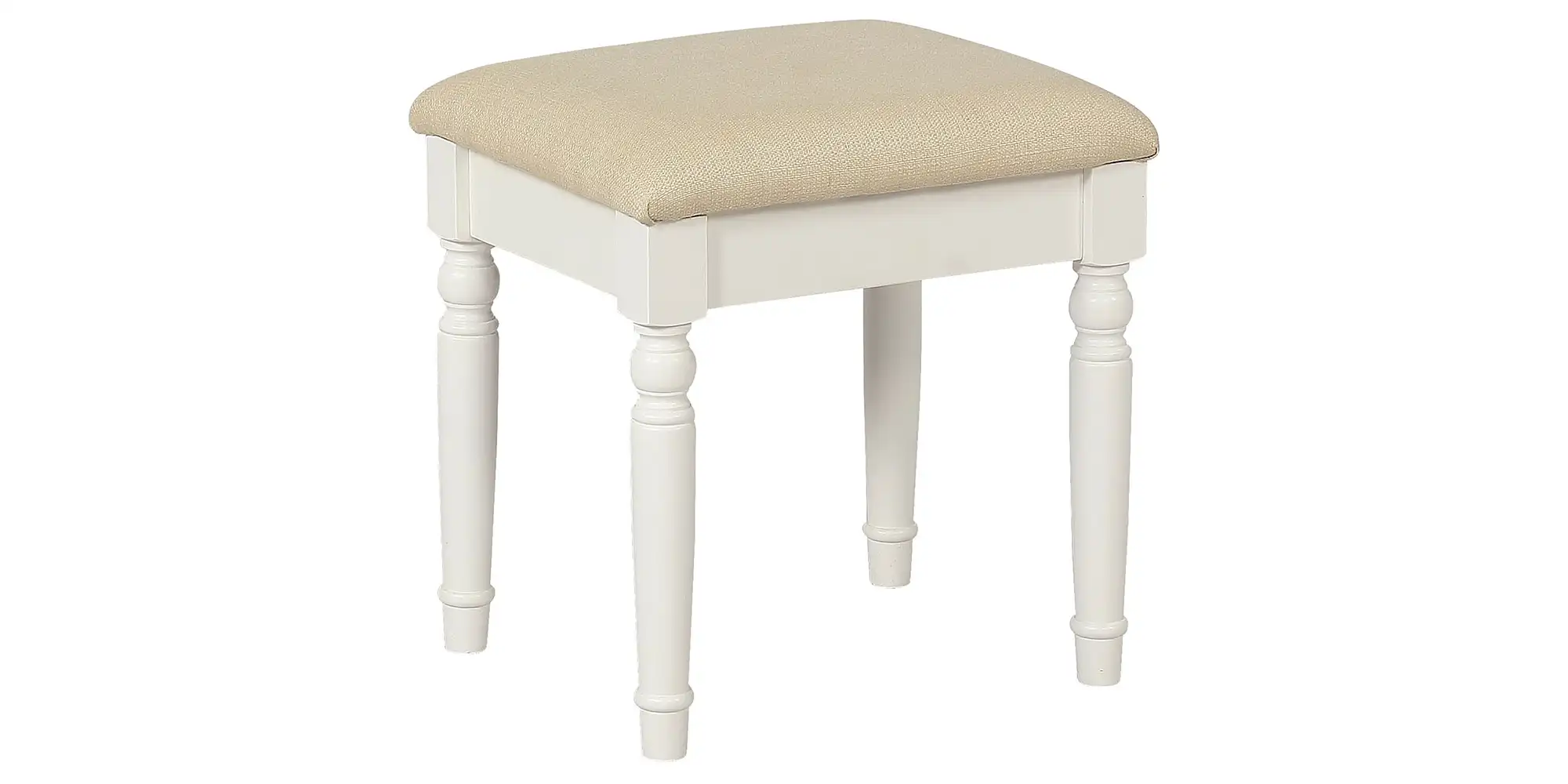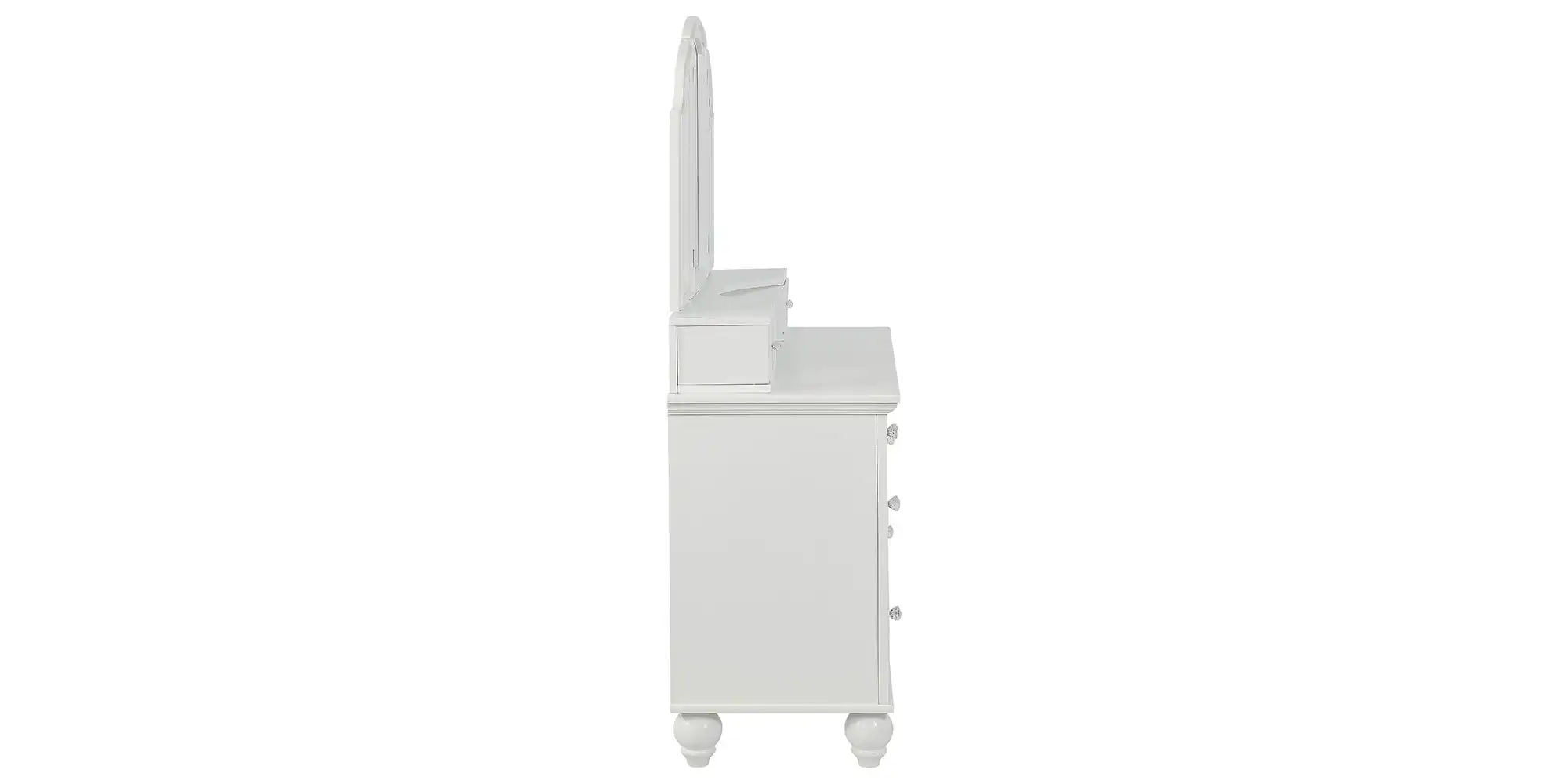 Full of glamour, this three piece vanity set is great for the budding fashionista. Crisp and clean, the desk features a bright white finish decorated with reflective mirror pieces on the nine drawers. The classic vanity mirror silhouette is updated with elegant curves. Two tiered drawers offer the perfect spot to store decorate perfume bottles or makeup brushes. Rounded legs emit a sophisticated aura, complemented by the delicate and intricate legs of the seat.