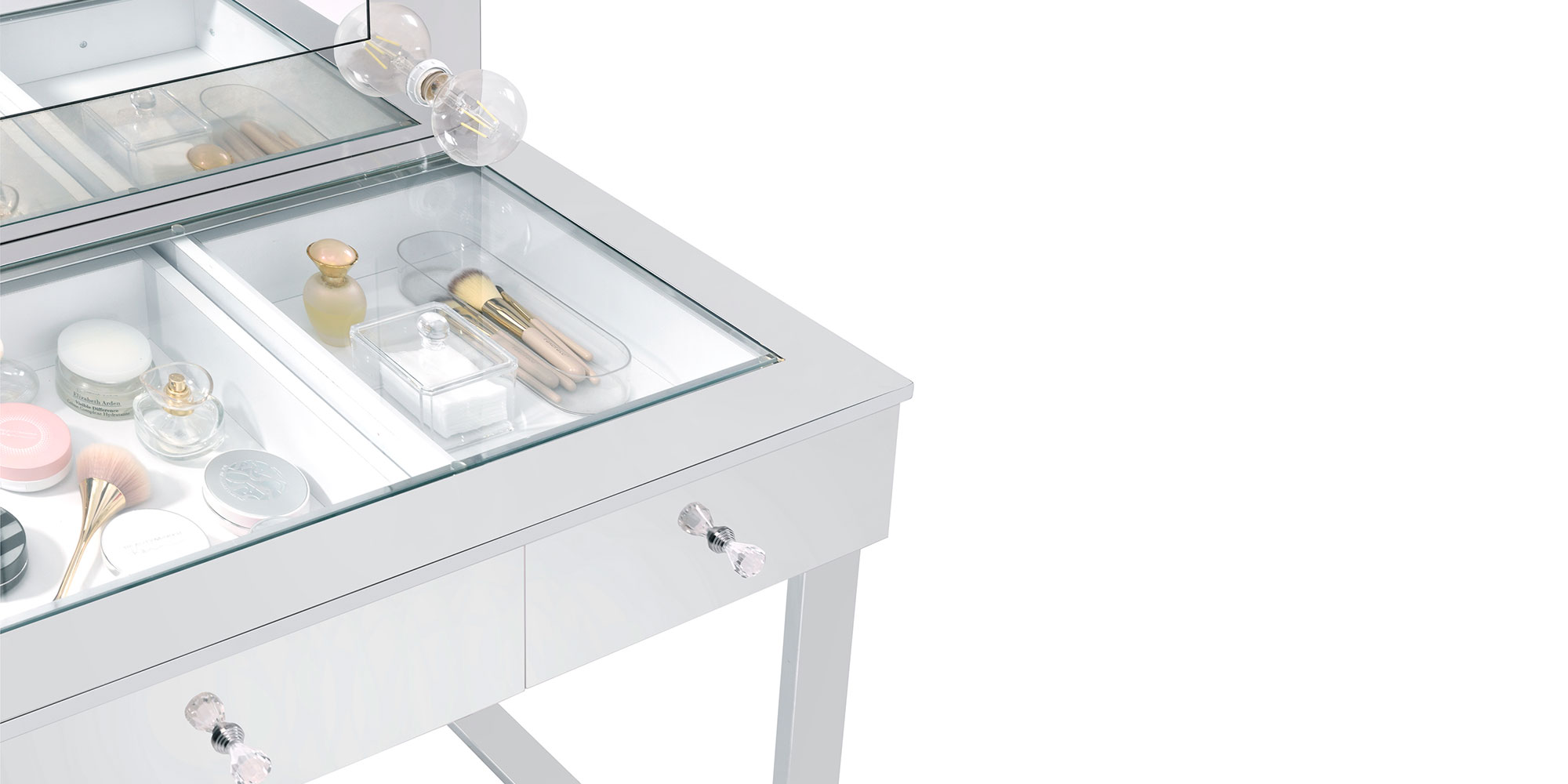 • Vanity table features a clear tempered glass top and three drawers allowing you to showcase your accessories