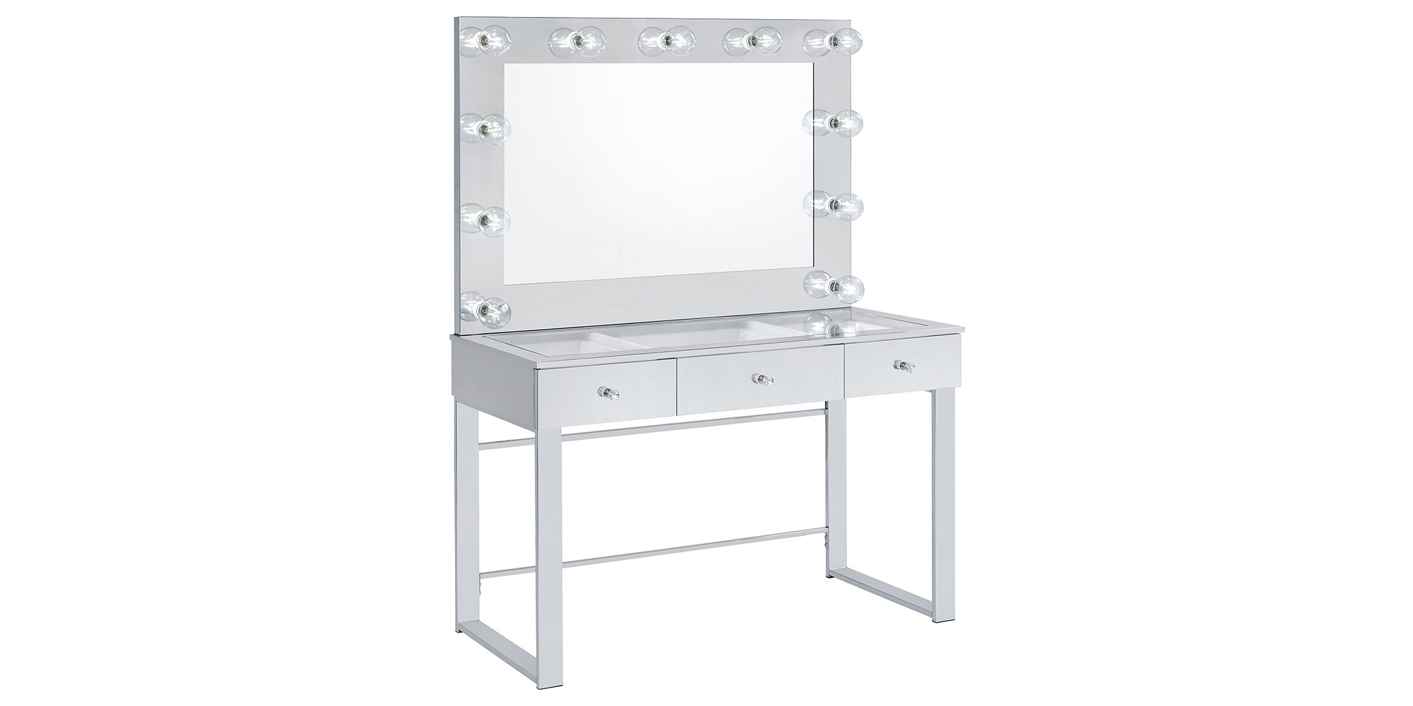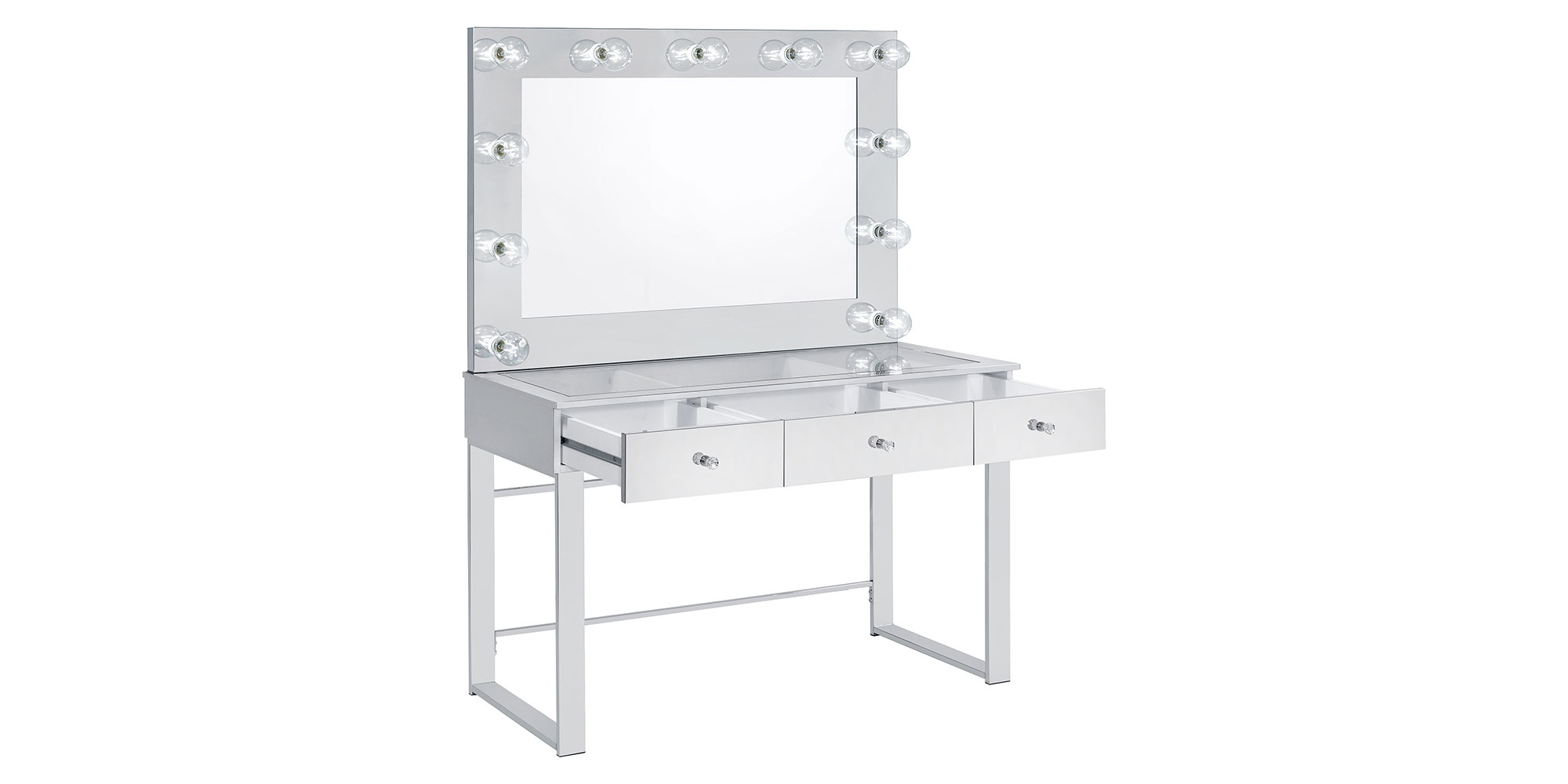 With a Hollywood regency flair, this modern vanity set features a stunning mirror paneled design that reflects surrounding hues. Cleverly designed with a clear tempered glass top that showcases cosmetics and accessories tucked inside the three drawers beneath, this vanity offers a unique functionality. Adorned on each of the three bright white drawers are crystal-like acrylic pulls, further lending to its dramatic glam flair. Mounted on the back is an oversized mirror framed in a mirror-like polished chrome metal finish, complete with a series of retro-inspired, Edison-style LED bulbs. Constructed with a heavy gauge steel base, this vanity set is made to last.