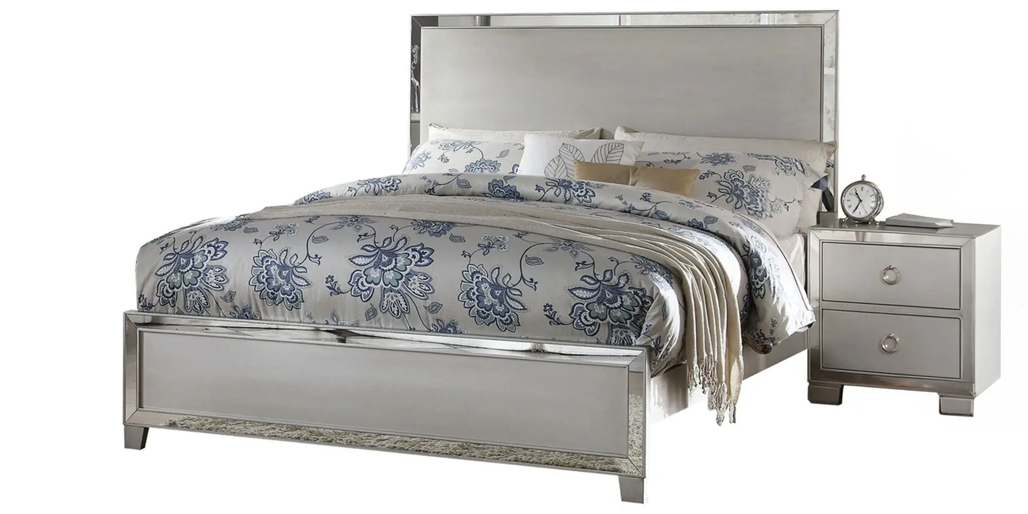 The Voeville II Collection will create a warmer and fresher environment in your master bedroom with its platinum finish. Features panel wooden headboard or upholstered PU headboard for you to choose from, complemented by mirror inlay trim, brings a unique more relaxing and modern taste. Create a fantastic look in your bedroom with the Voeville II Collection.